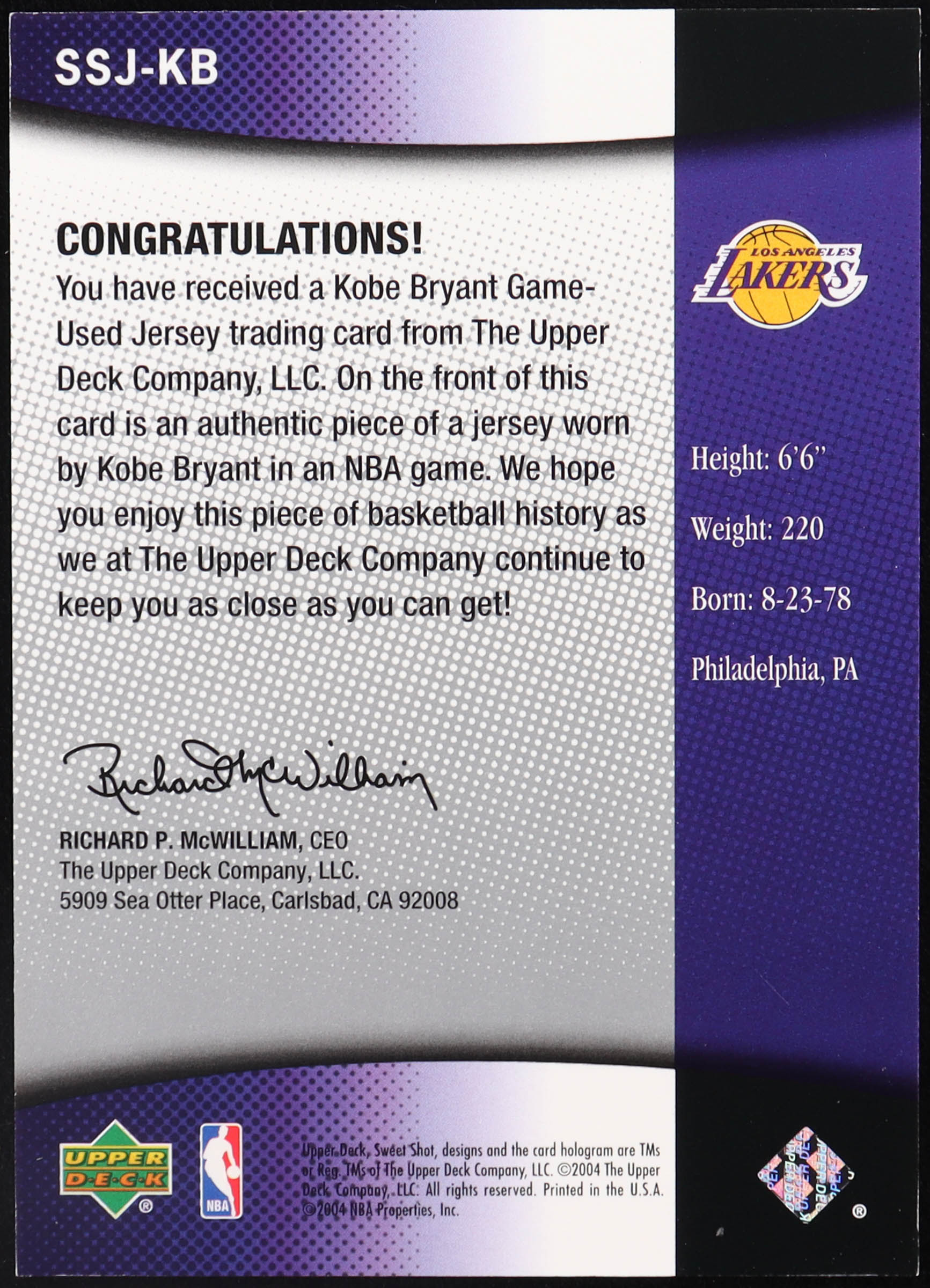 Kobe Bryant 2004 Upper Deck Sweet Shot Jerseys #SSJKB
