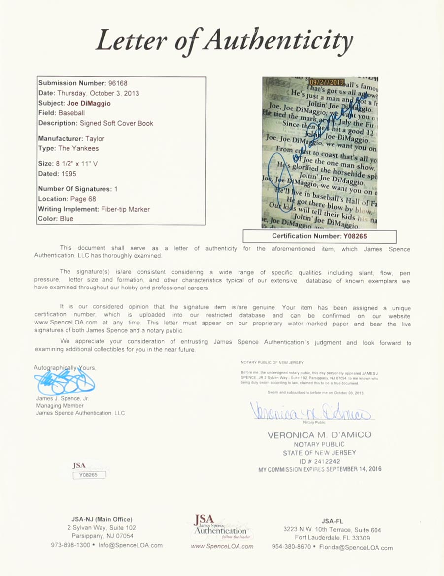 "The Yankees" paperback book hand-signed on the cover by Joe DiMaggio (D. 1999, New York Yankees, HOF). Please refer to photos for more details on the condition of the item.