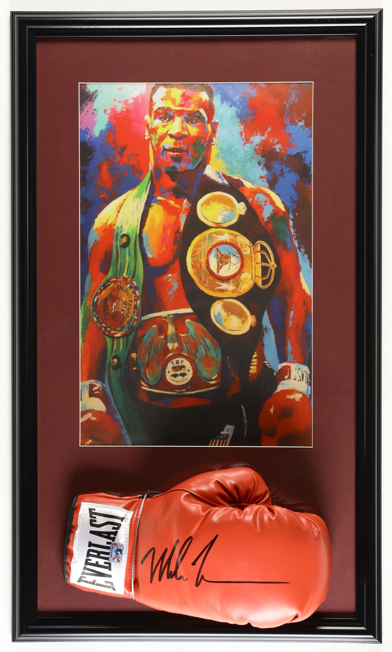 Custom frame measures approximately 17" x 29" in size and features an Everlast boxing glove that has been hand-signed by Mike Tyson (HOF). Display also includes a multi-color art print of Tyson.