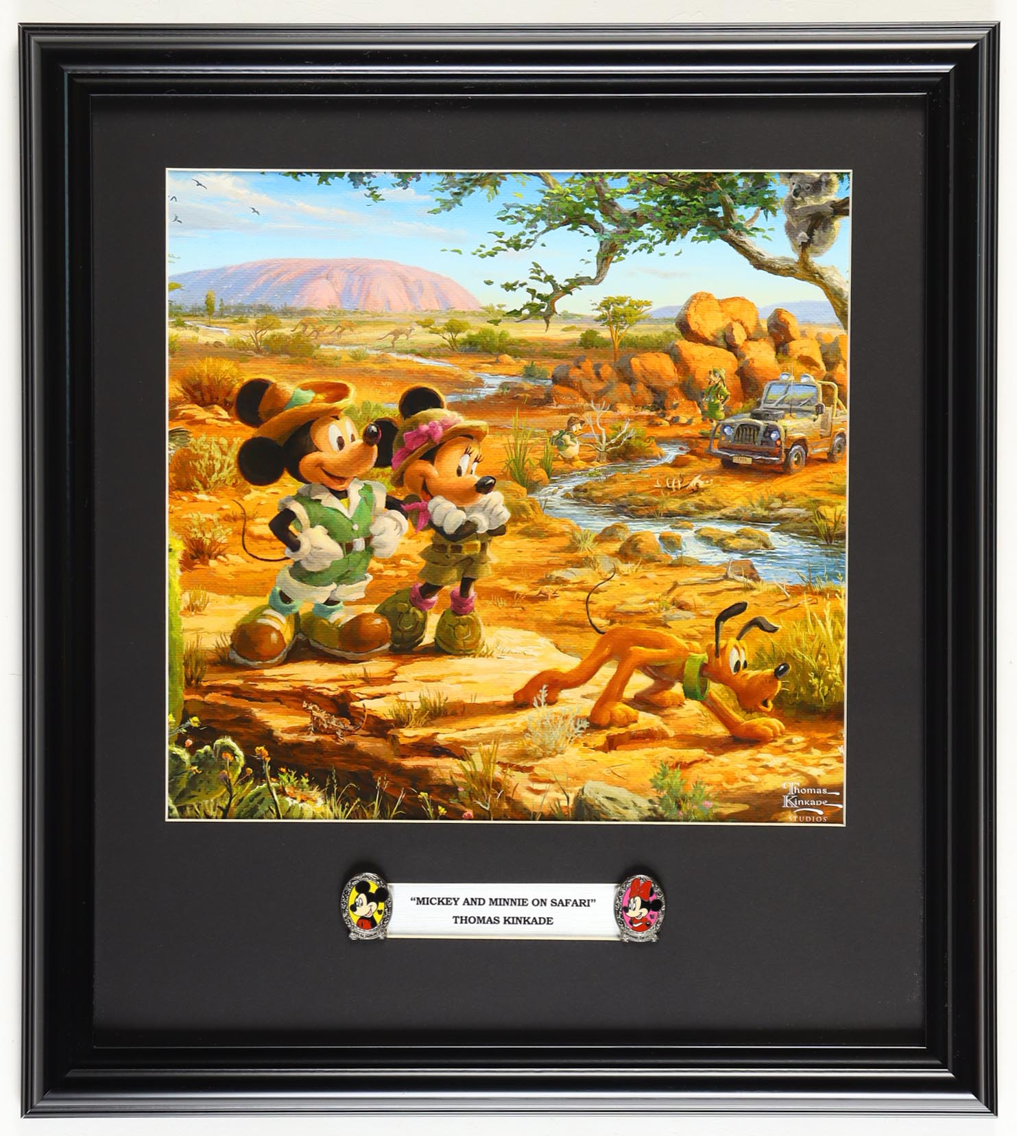Custom frame display measures approximately 16" x 18" in size and features a print of "Mickey and Minnie on Safari" by Thomas Kinkade (D. 2012). Includes Set of (2) Disney Mickey and Minnie Mouse Pins. Please note, the display is unsigned.
