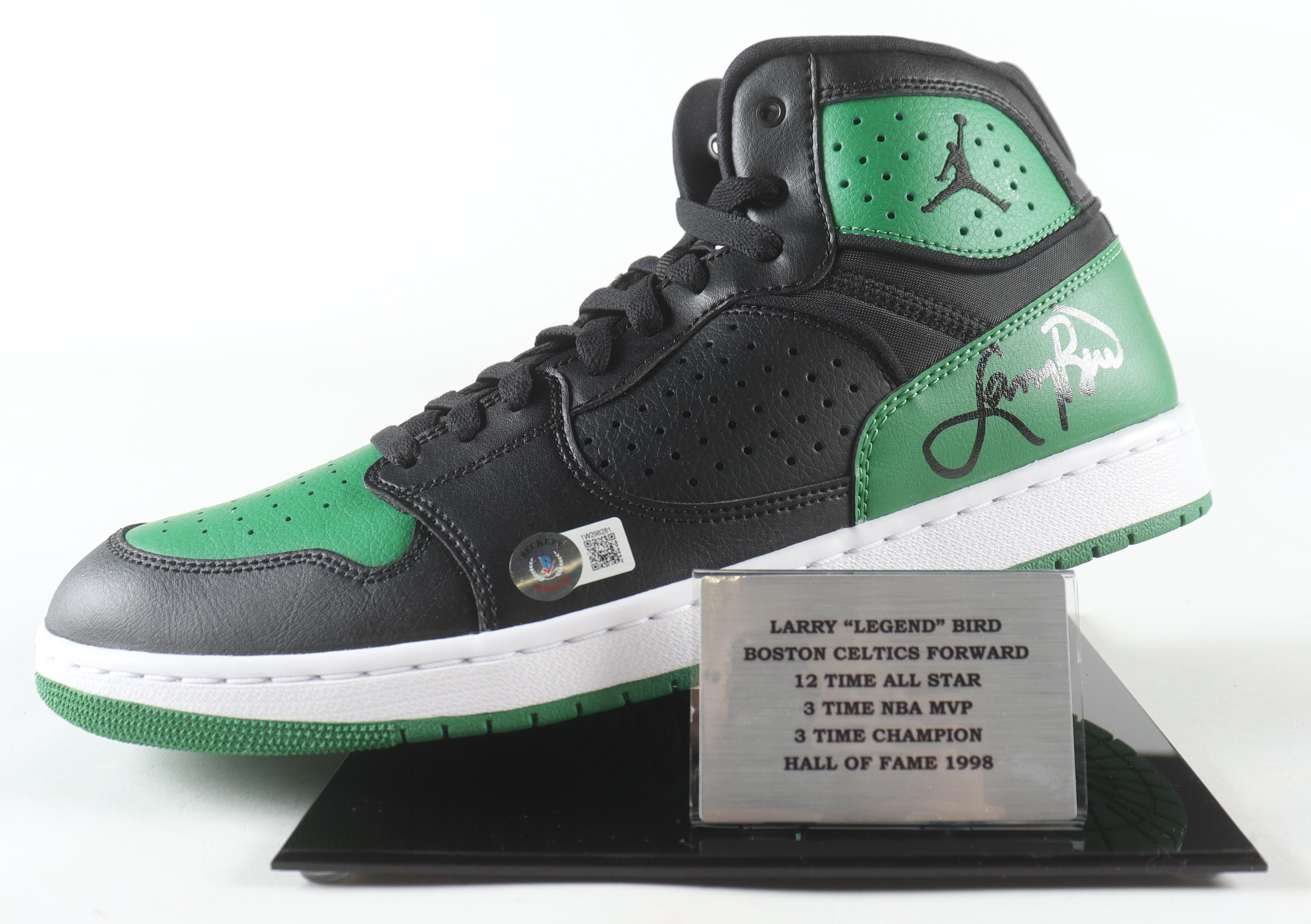 Nike Air Jordan basketball shoe. Hand-signed by Larry Bird (Boston Celtics, HOF). Display case comes as shown. Please refer to photos for the condition of the shoe.