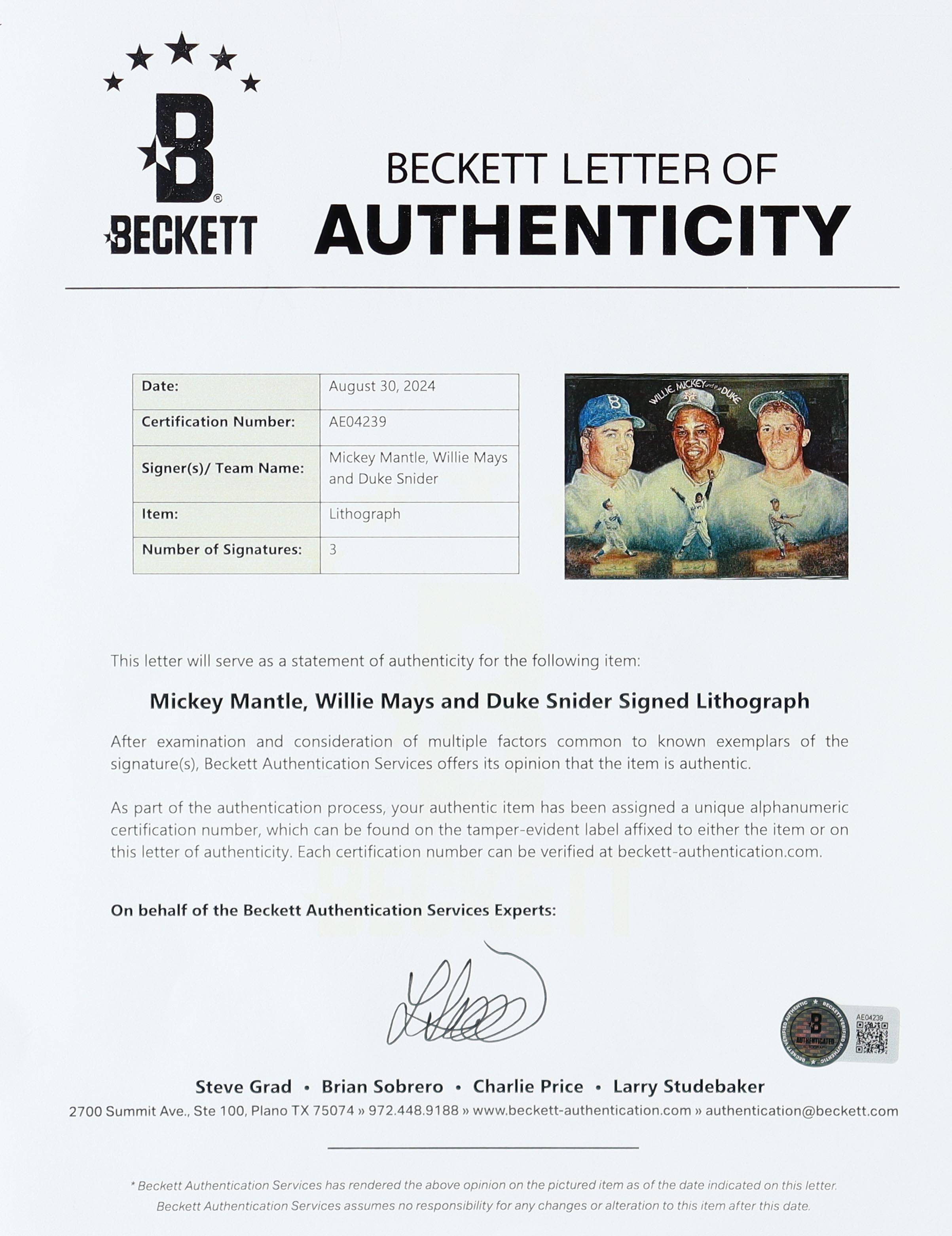 The print includes an official Beckett Authentication Services hologram and matching LOA for authenticity purposes.