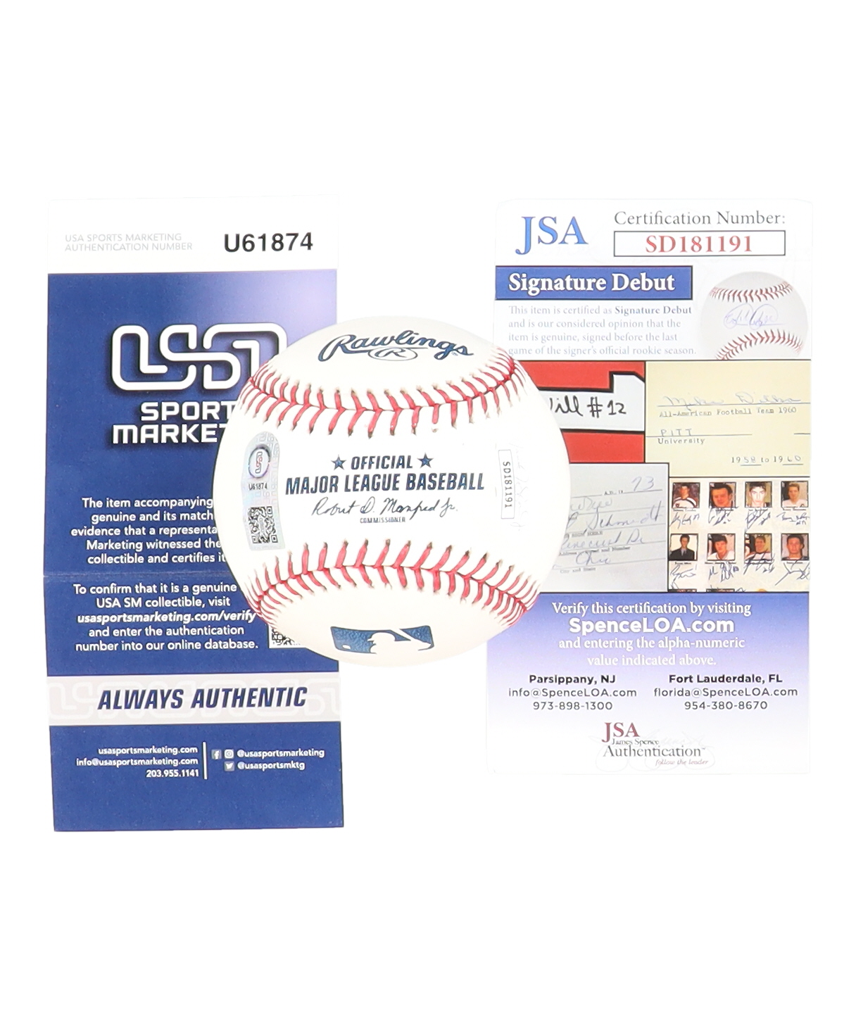 The lot / autograph(s) includes an official USA Sports Marketing (USA SM) hologram and matching COA, as well as an official James Spence Authentication (JSA) "Signature Debut" hologram and COA. "Signature Debut" is the autographed memorabilia equivalent to a rookie card. The JSA definition of a "Signature Debut" is as follows: "Any item that is autographed and received by JSA prior to the last game of the signer's official rookie season. for authenticity purposes.