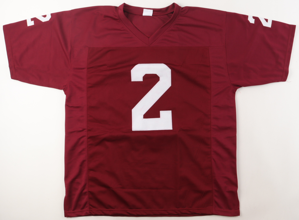 Custom jersey with everything sewn on, size XL. Hand-signed and inscribed by Johnny Manziel. Please note, glue is visible through the reverse number.