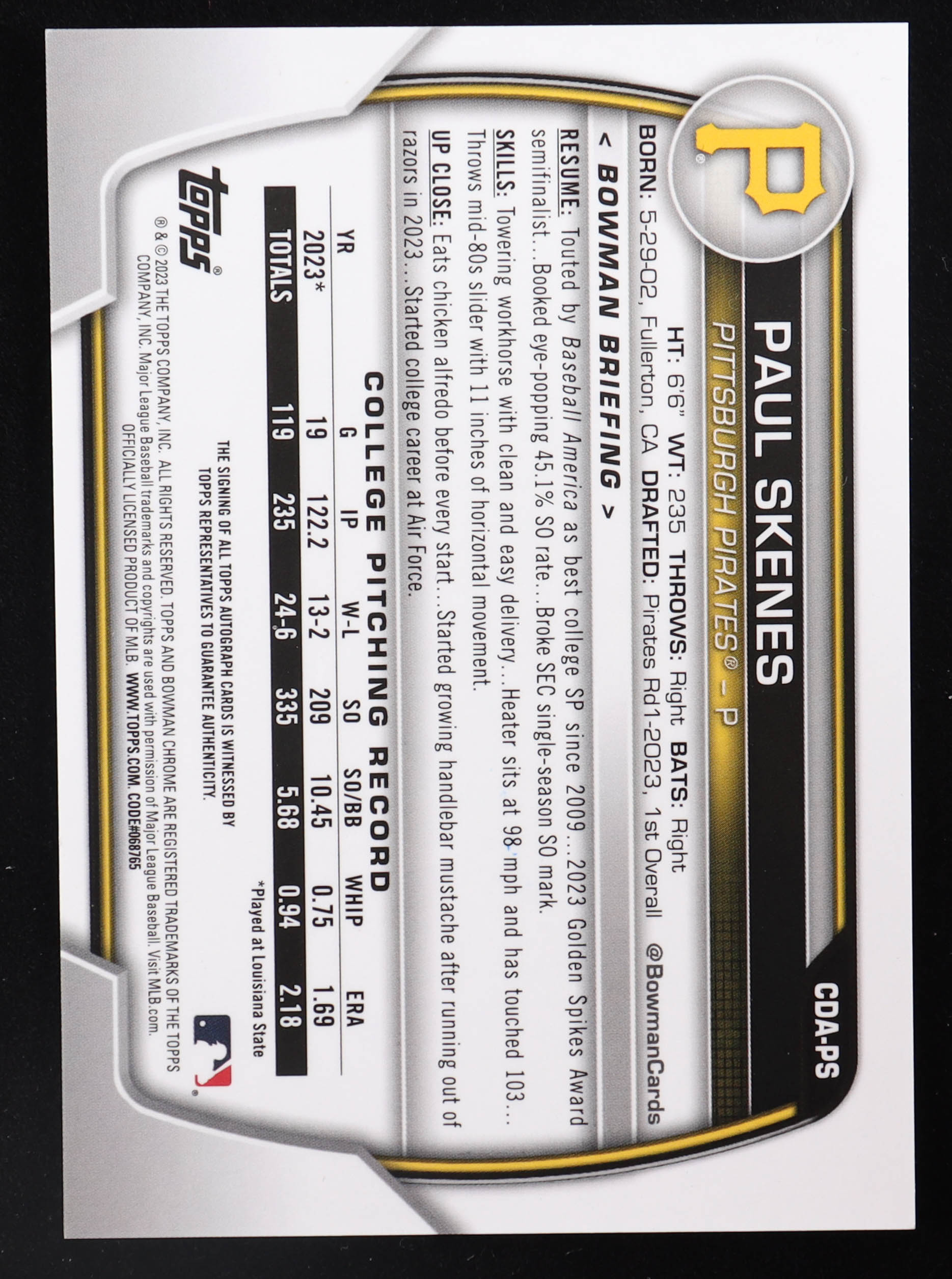 Paul Skenes 2023 Bowman Chrome Draft Autographs #CDAPS RC