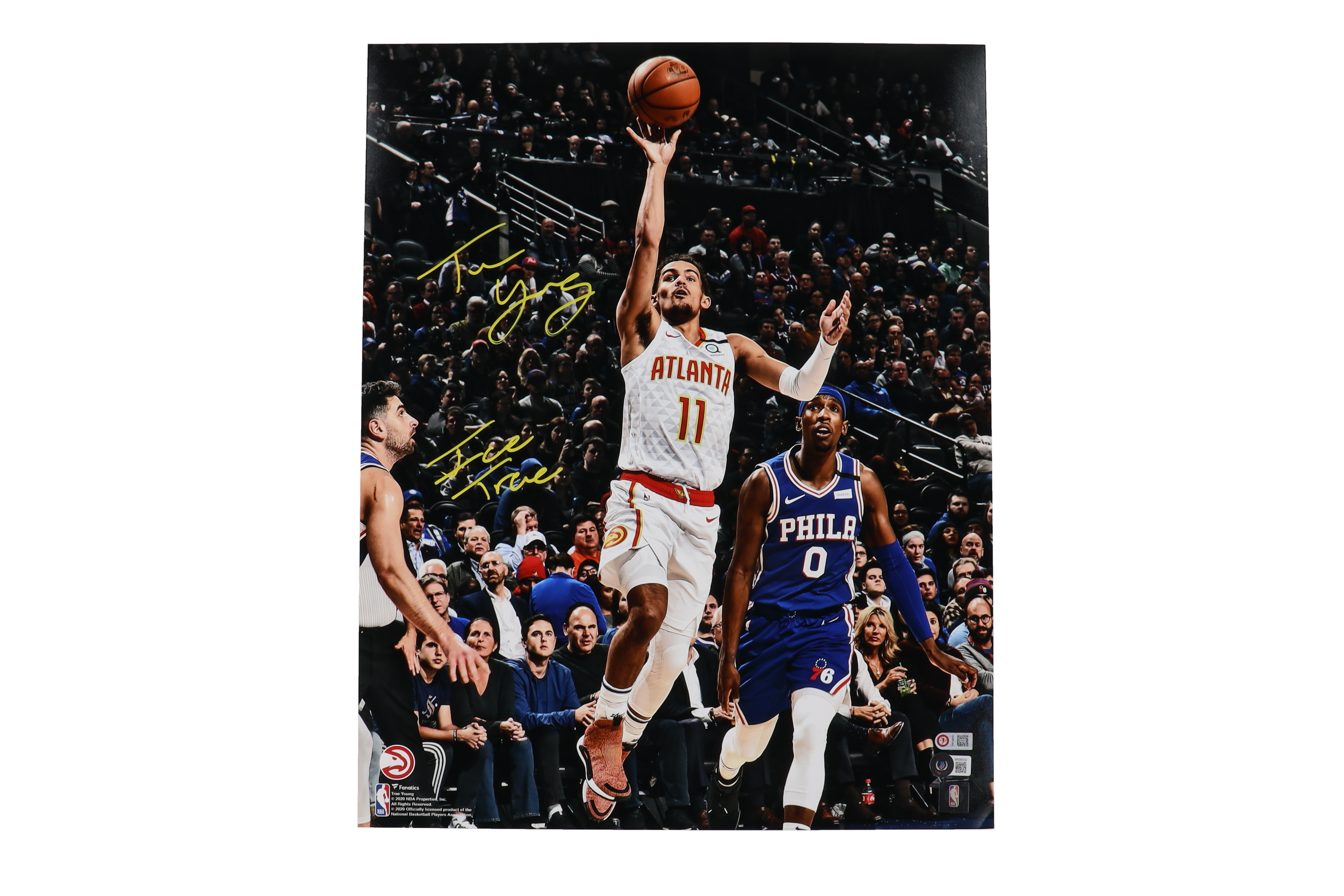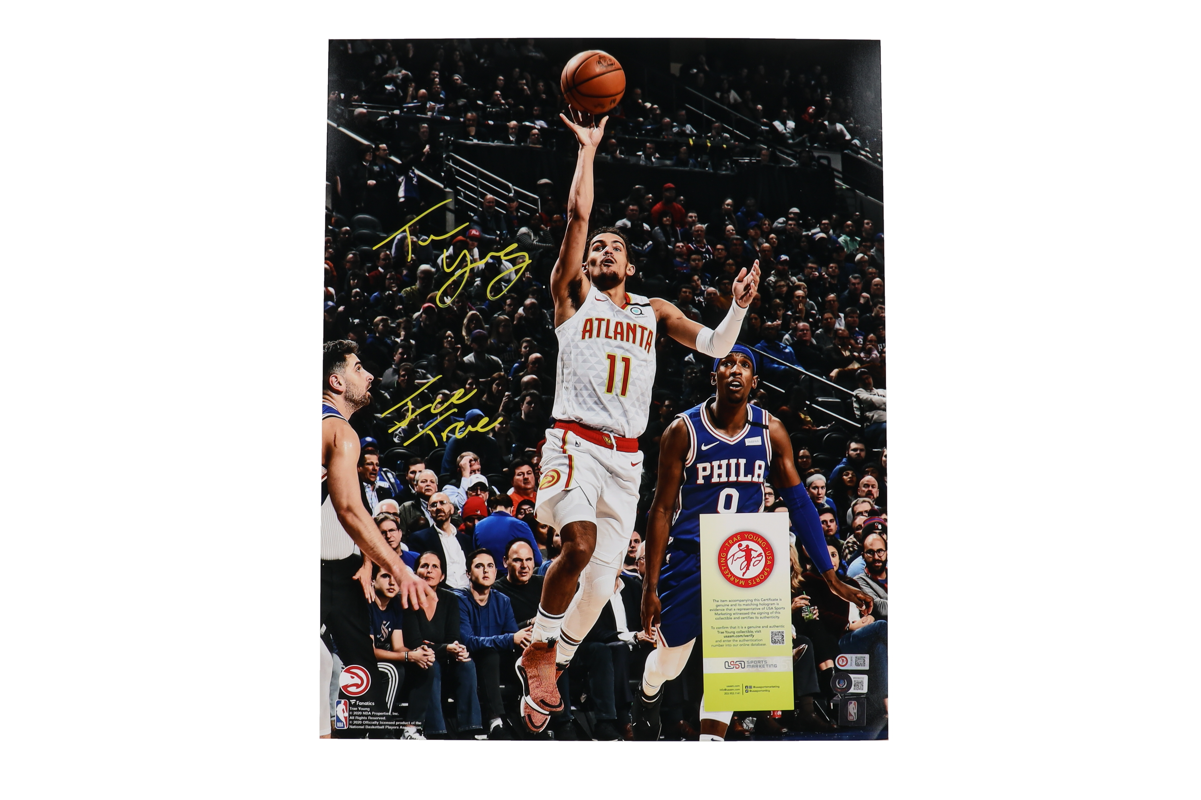Photo measures 16" x 20" in size and has been hand-signed and inscribed by Trae Young (Atlanta Hawks).