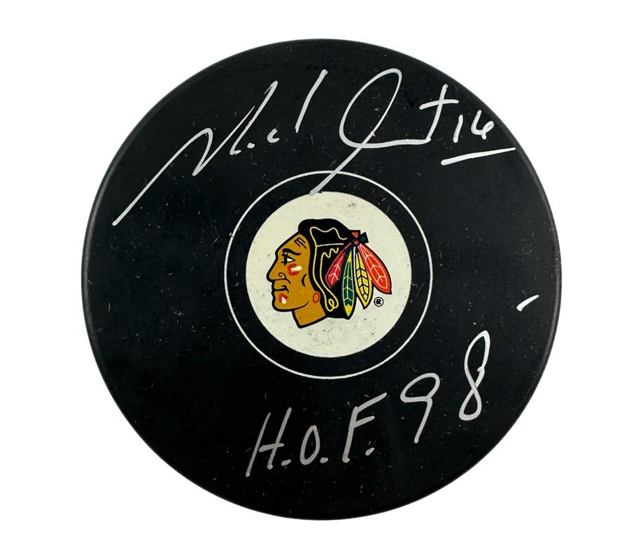 Chicago Blackhawks logo hockey puck has been hand-signed and inscribed by Michel Goulet (HOF).