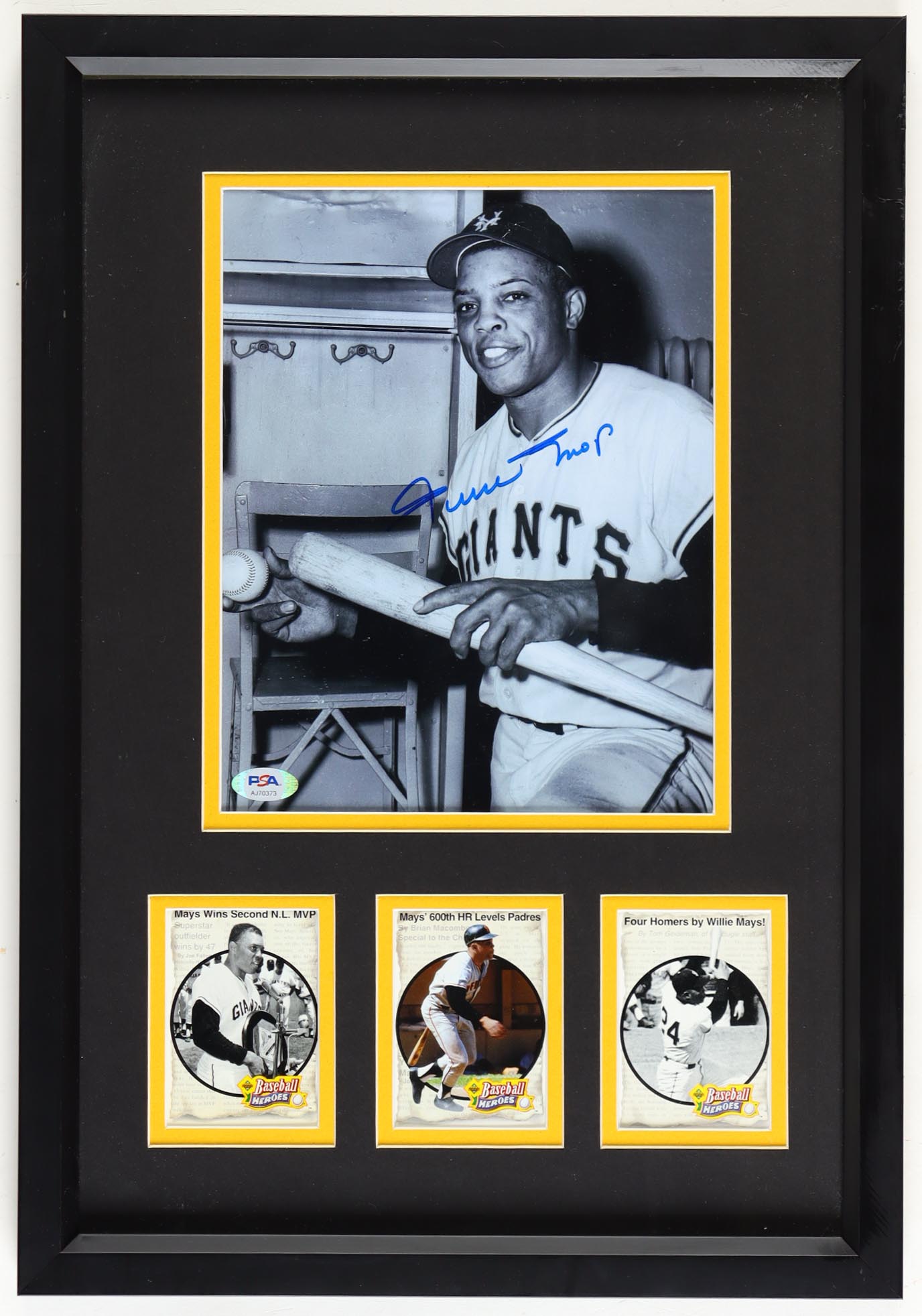 Custom frame measures approximately 13.25" x 19.25" in size and features a photo that has been hand-signed by Willie Mays (D. 2024, San Francisco Giants). The display also includes (3) player trading cards. Please note, the frame has scuffing on the borders and the trading cards are unsigned.