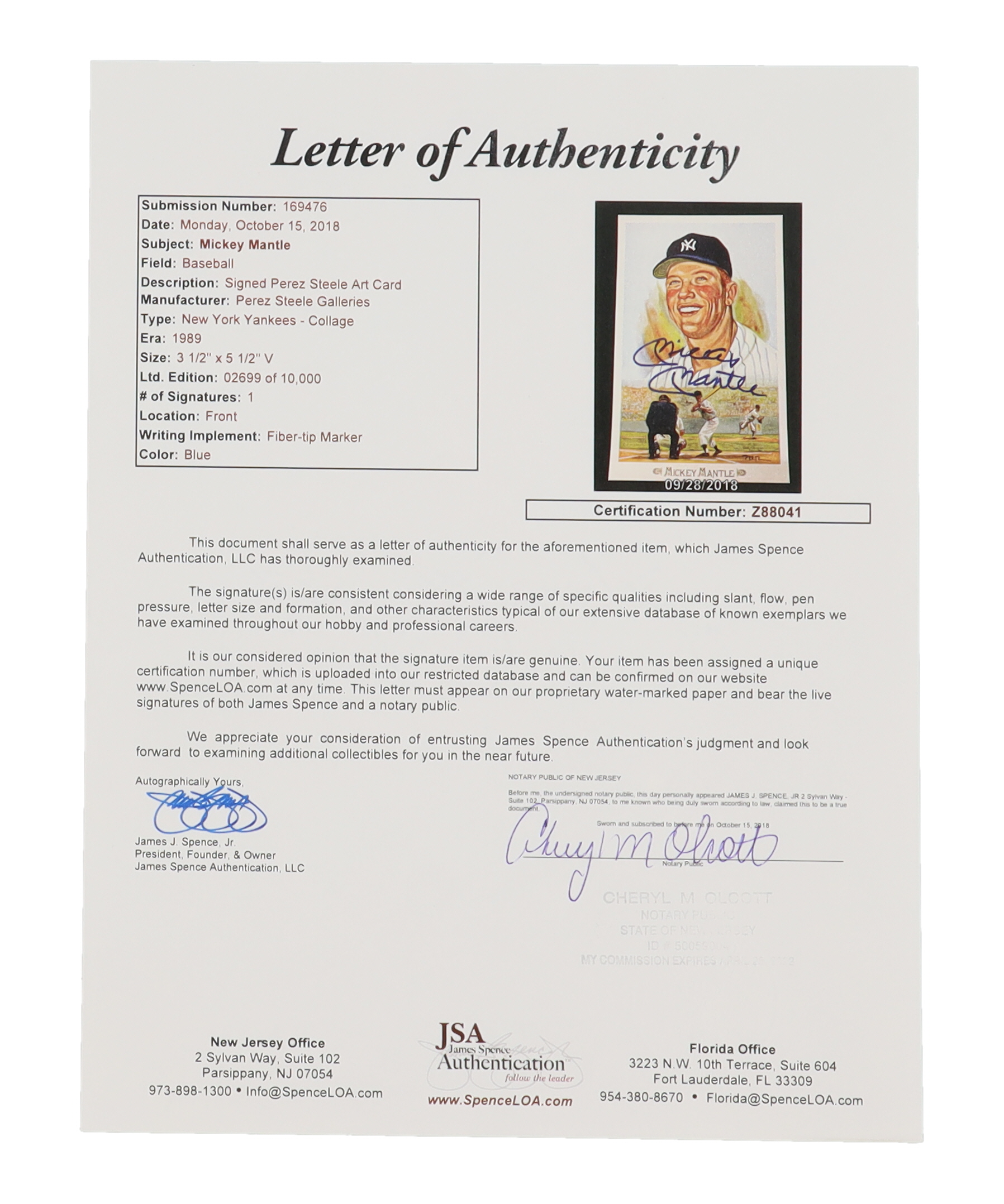 Postcard has been hand-signed by Mickey Mantle (D. 1995, New York Yankees, HOF). Postcard is limited edition numbered #2,699/10,000.