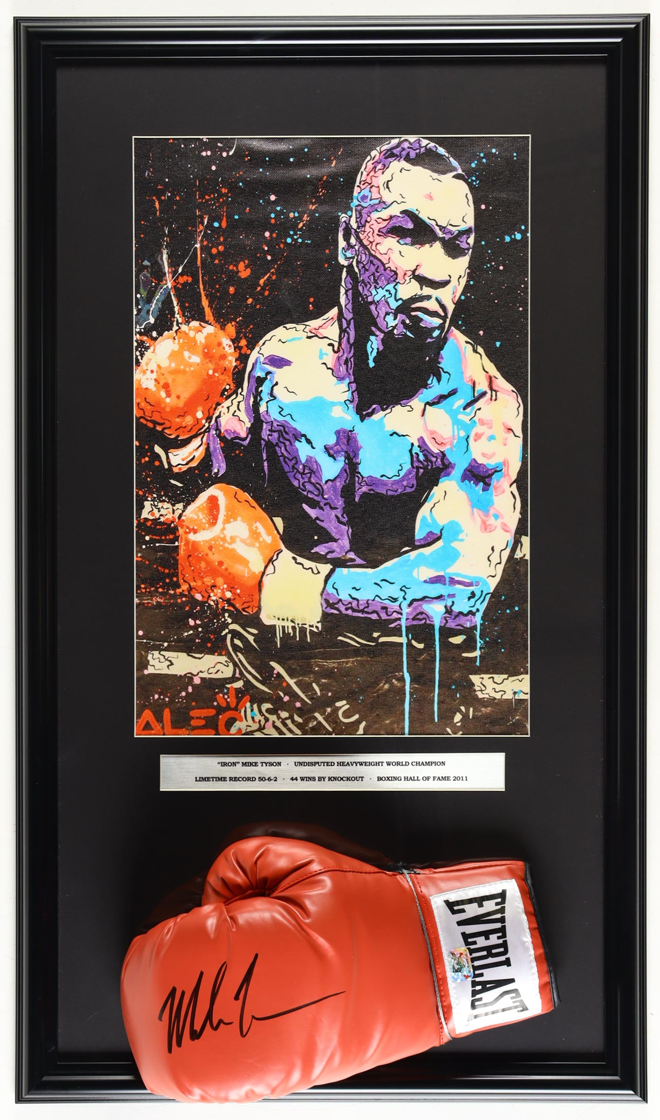 Custom frame measures approximately 18" x 31" in size. Features a boxing glove that has been hand-signed by Mike Tyson (HOF). The display also includes an unsigned art print.