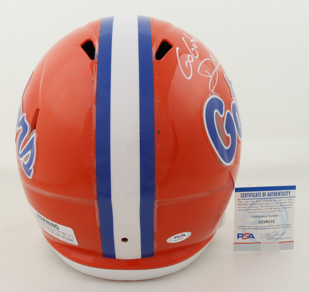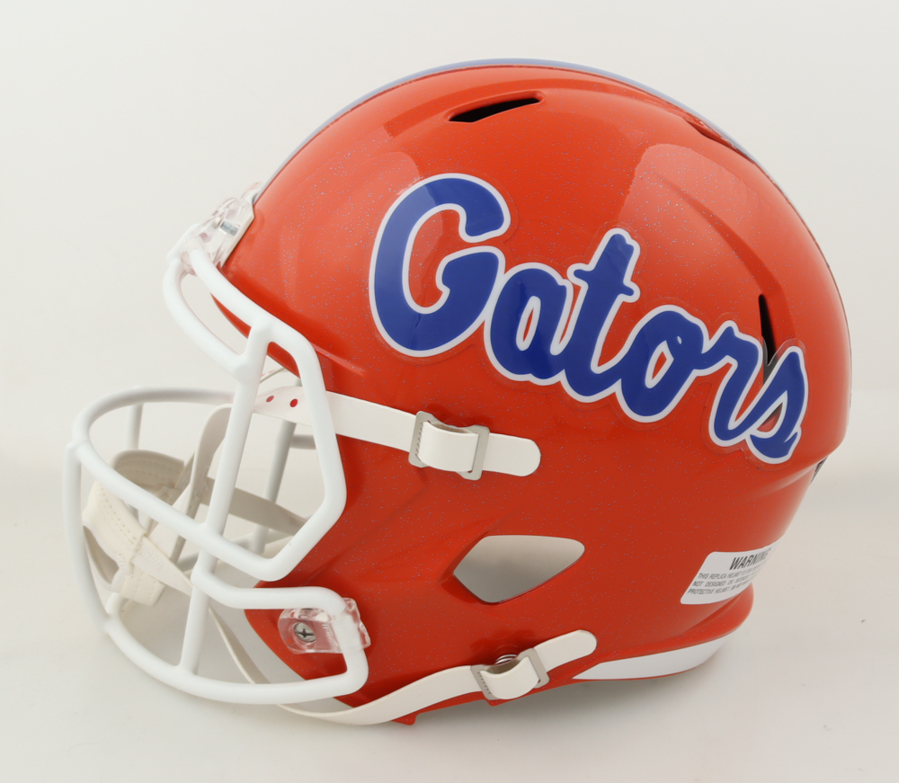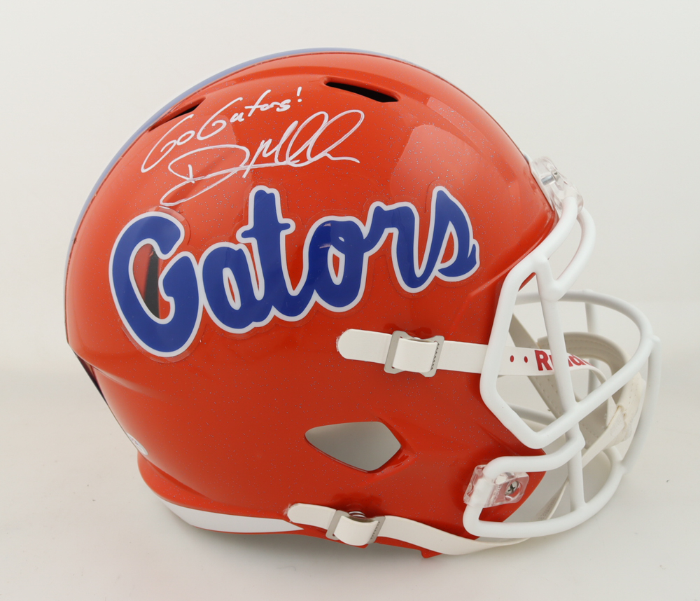 Riddell Florida Gators full-size speed replica helmet has been hand-signed and inscribed by Dan Mullen.