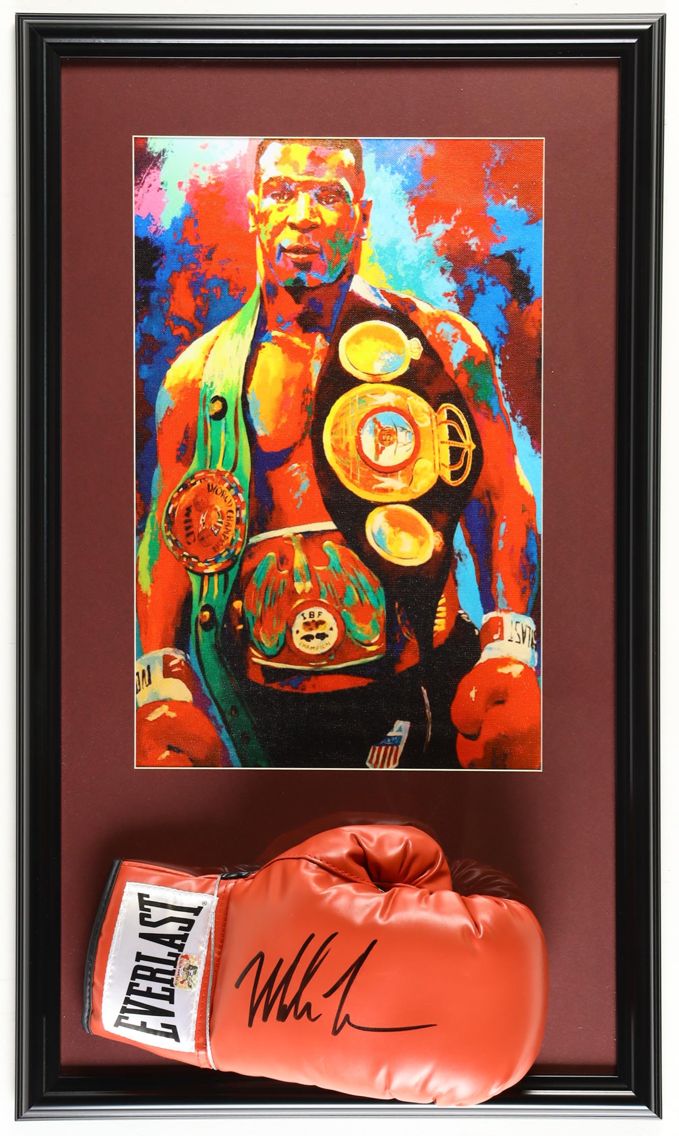 Custom frame measures approximately 17.25" x 29.25" in size and features an Everlast boxing glove that has been hand-signed by Mike Tyson (HOF) as well as an art print of Tyson.