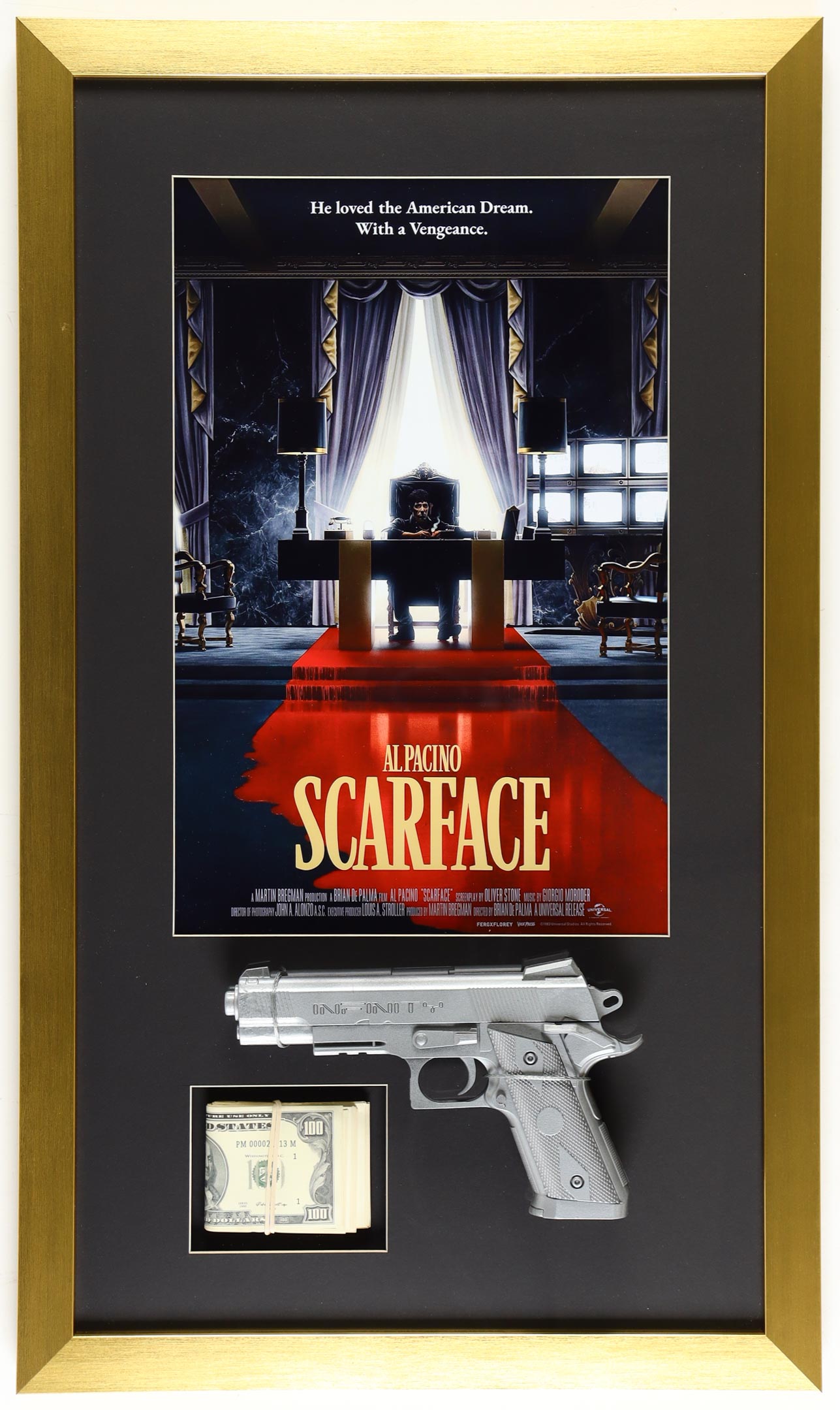 Custom frame measures approximately 17" x 29" in size and features an unsigned movie poster print from the film "Scarface". Display also features a prop replica money stack and a prop pistol. Please note, the display is unsigned.