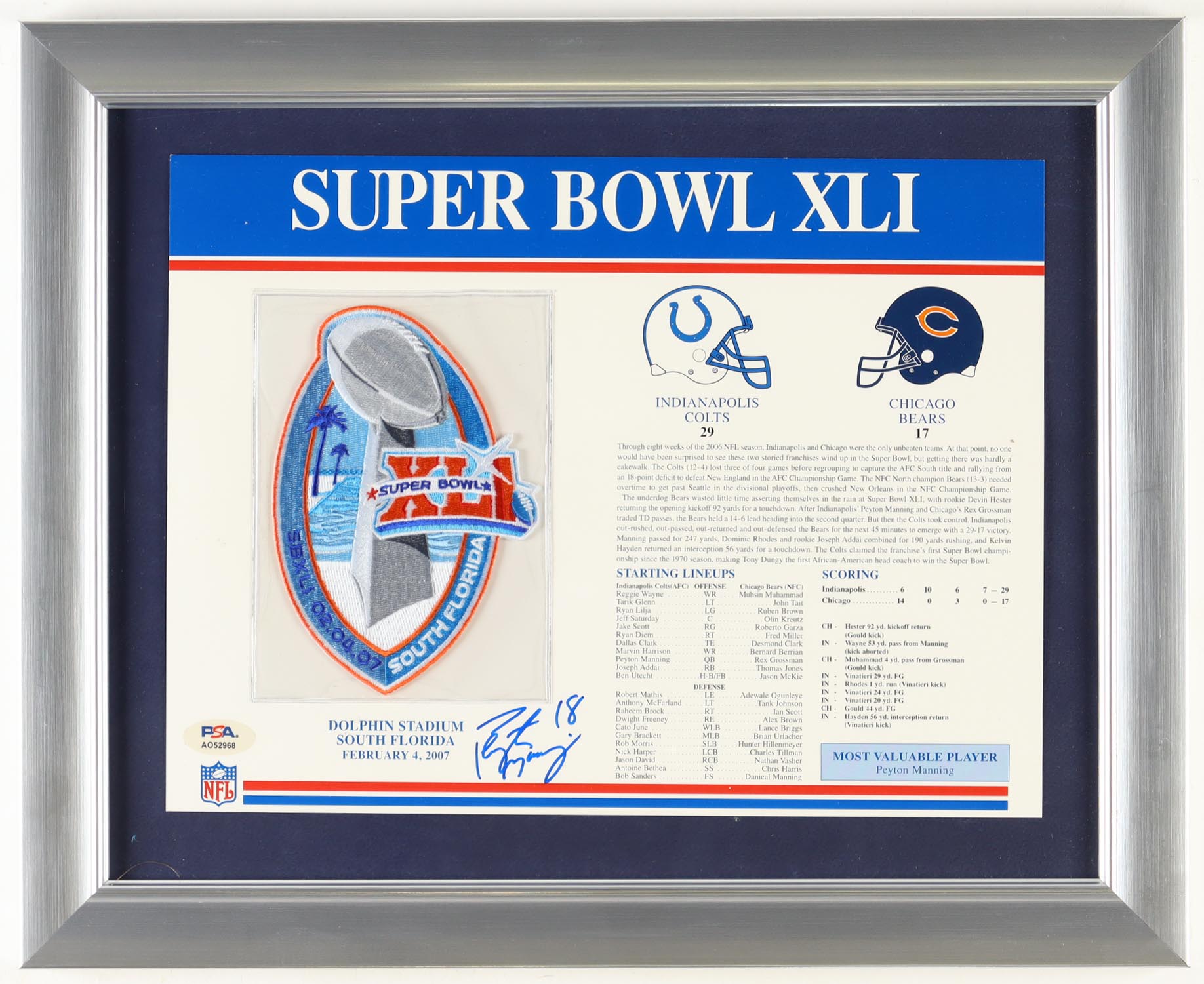 Peyton Manning Signed 2007 Super Bowl XLI "Colts Vs. Bears" Custom Framed Commemorative Stat Card Display With Cloth Uniform Patch (PSA)