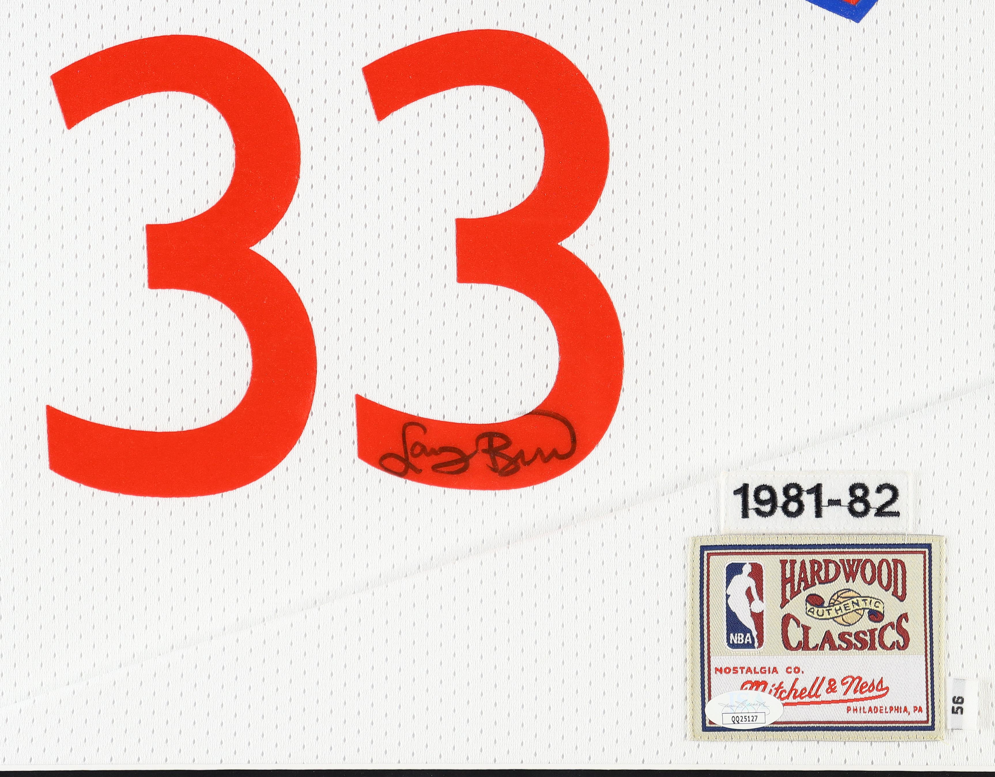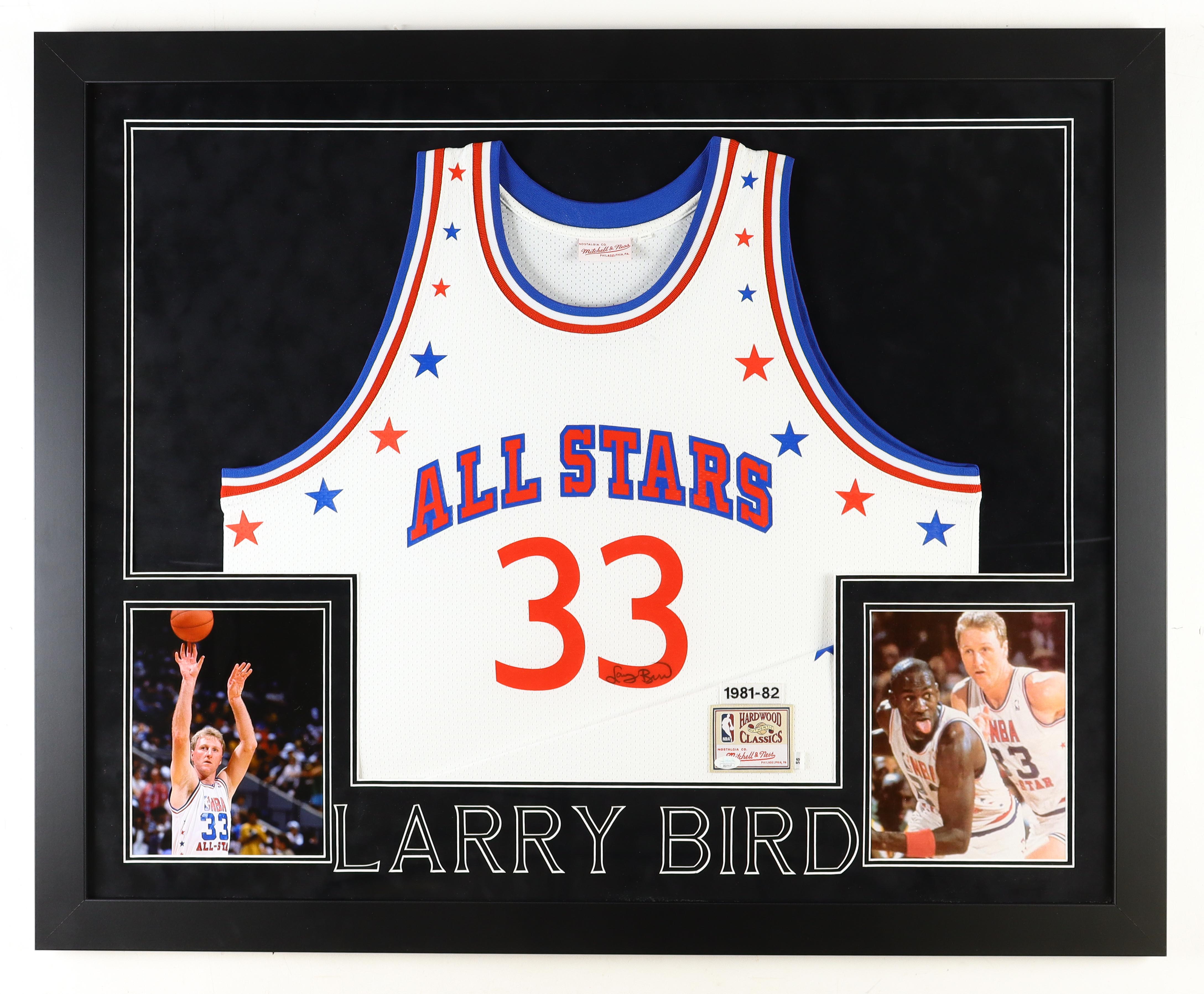 Custom frame measures 35.5" x 43.5" in size and features a Mitchell & Ness Hardwood Classics All-Star jersey that has been hand-signed by Celtics legend, Larry Bird!