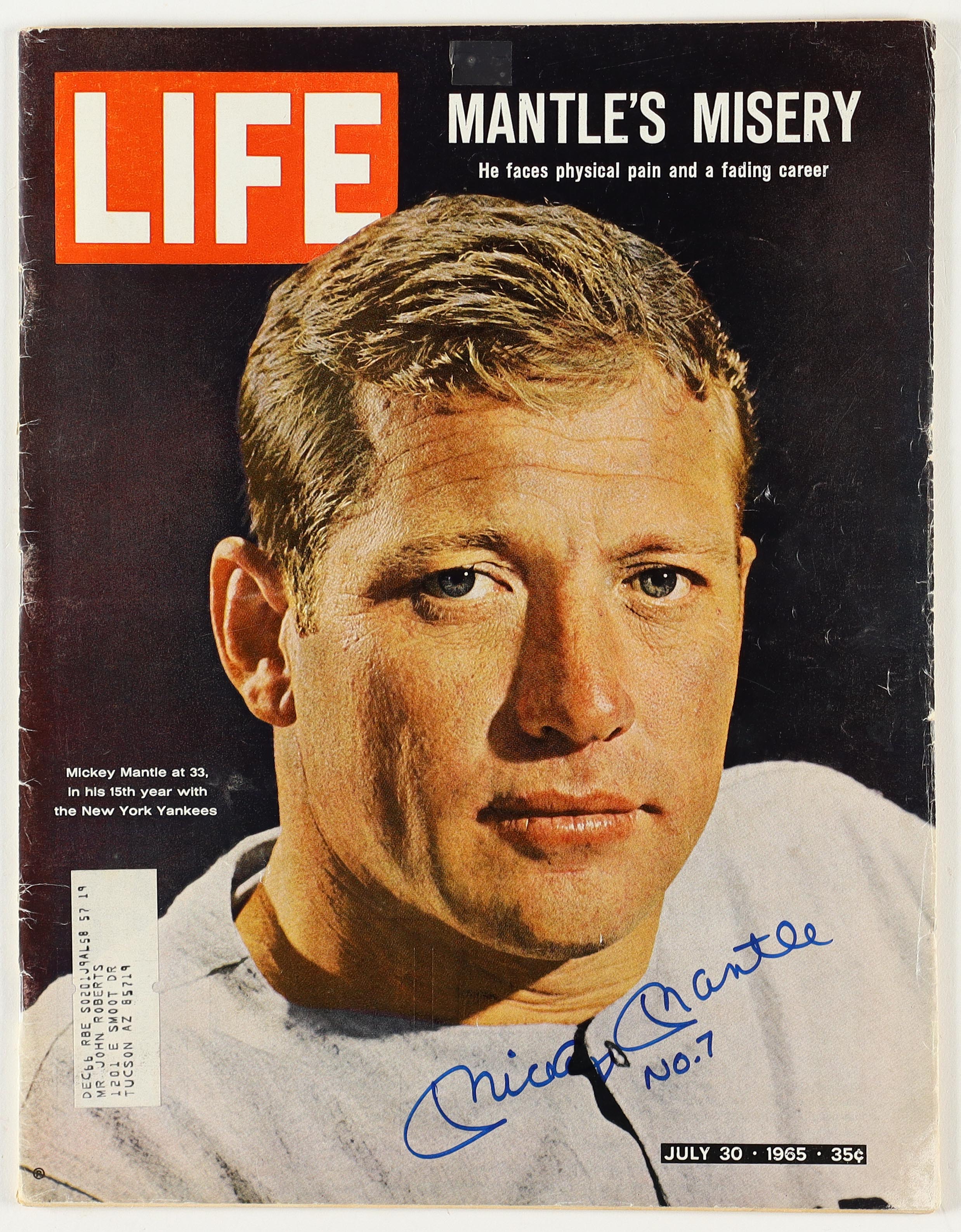 "Life" Magazine dated July 30, 1965. Hand-signed on the cover by Mickey Mantle (D. 1995, New York Yankees, HOF). Please note, the magazine shows signs of natural aging as well as tears, creasing and scuffing on the cover.