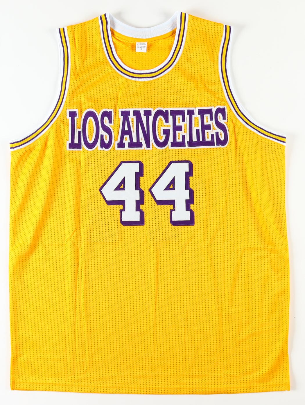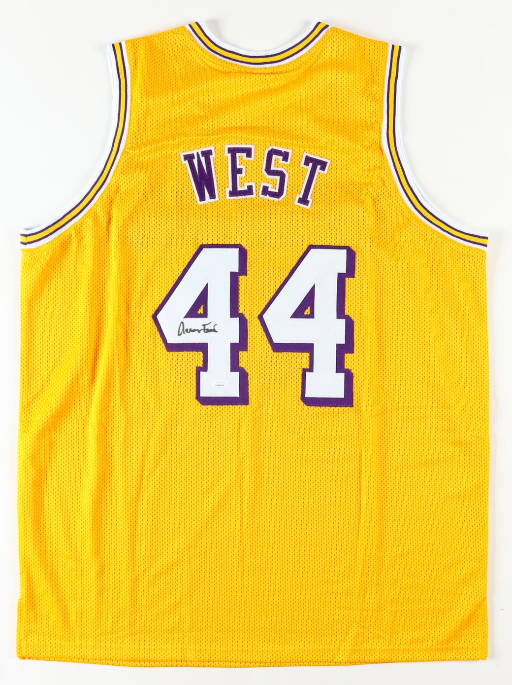 Custom jersey with everything sewn on, size XL. Hand-signed by Jerry West (D. 2024, HOF).