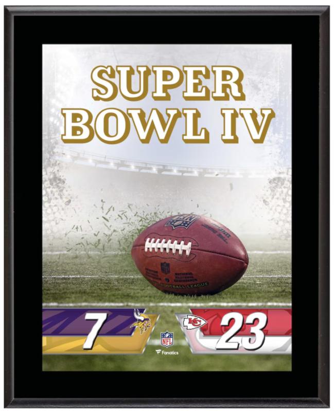Sublimated plaque measures 10" x 13" in size and features the Kansas City Chiefs vs. Minnesota Vikings from Super Bowl IV.