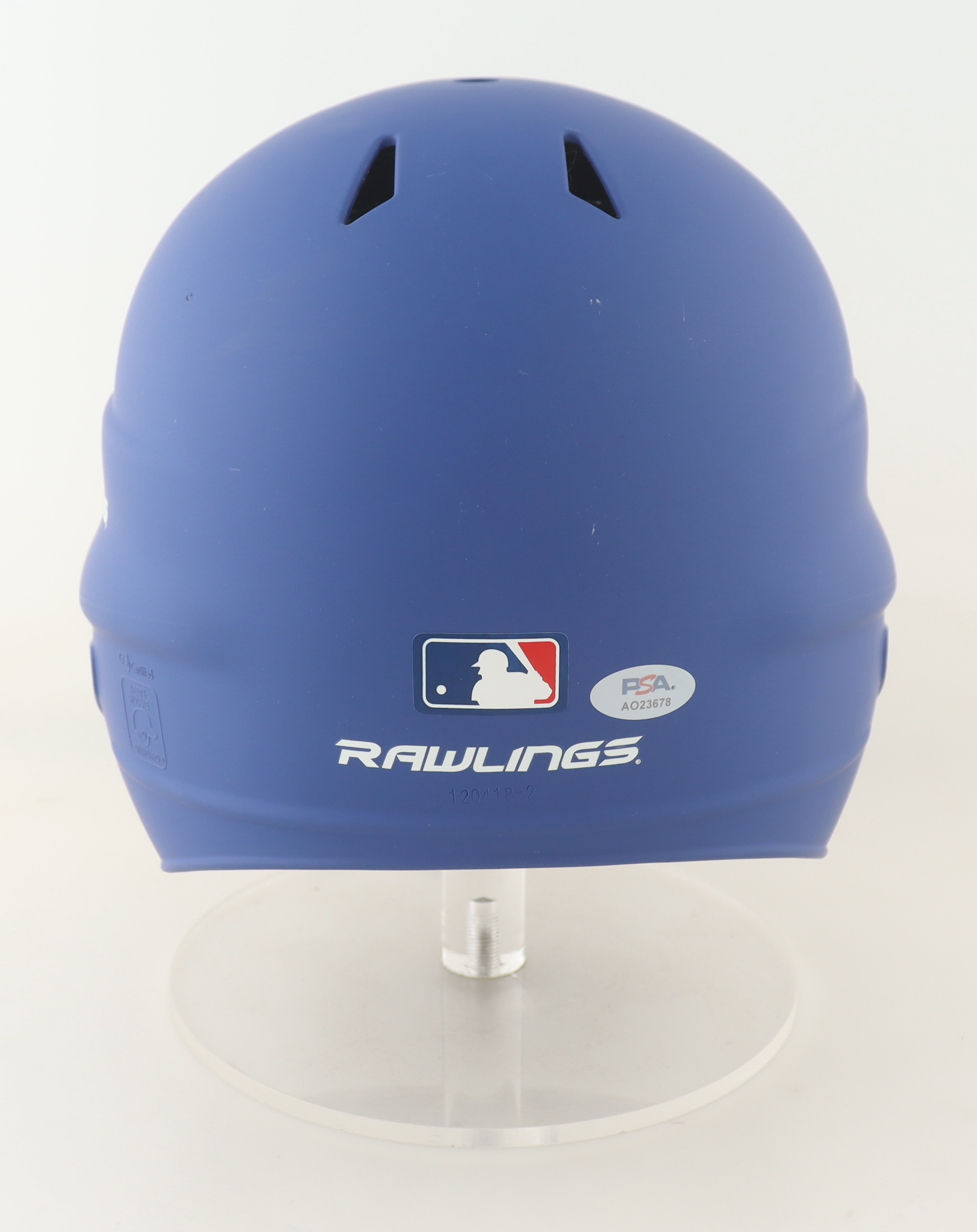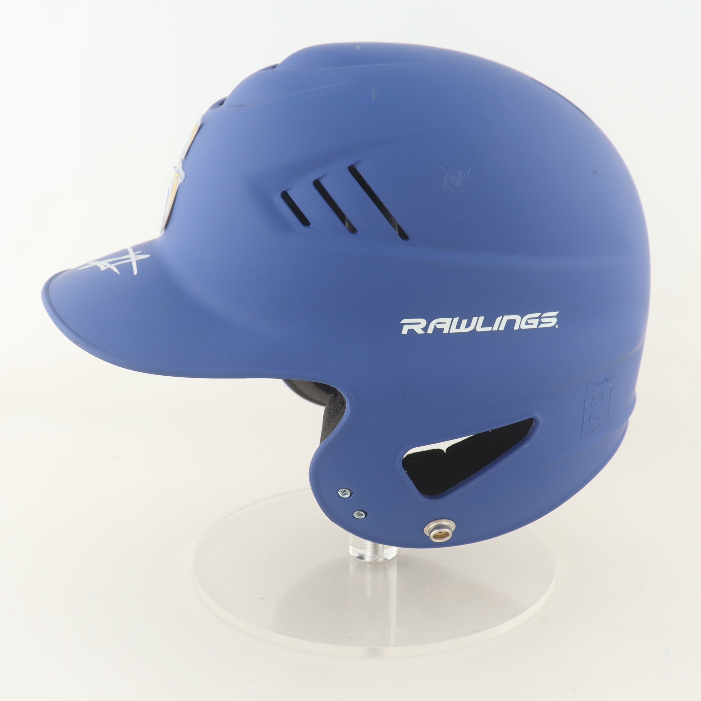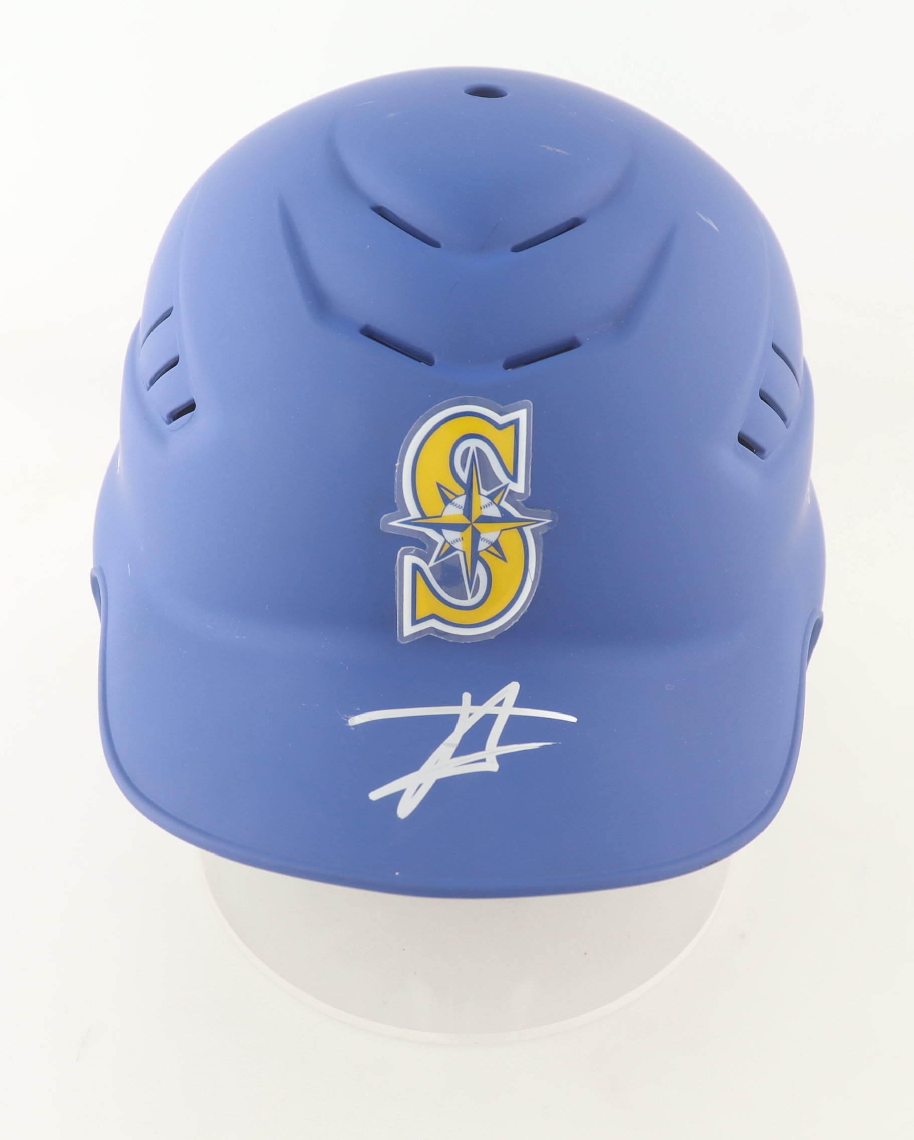 Seattle Mariners full-size authentic on field batting helmet. Hand-signed by Julio Rodriguez. Please note, there is scuffing on the helmet and the logo decal is peeling. Additionally, the display stand is not included as shown.