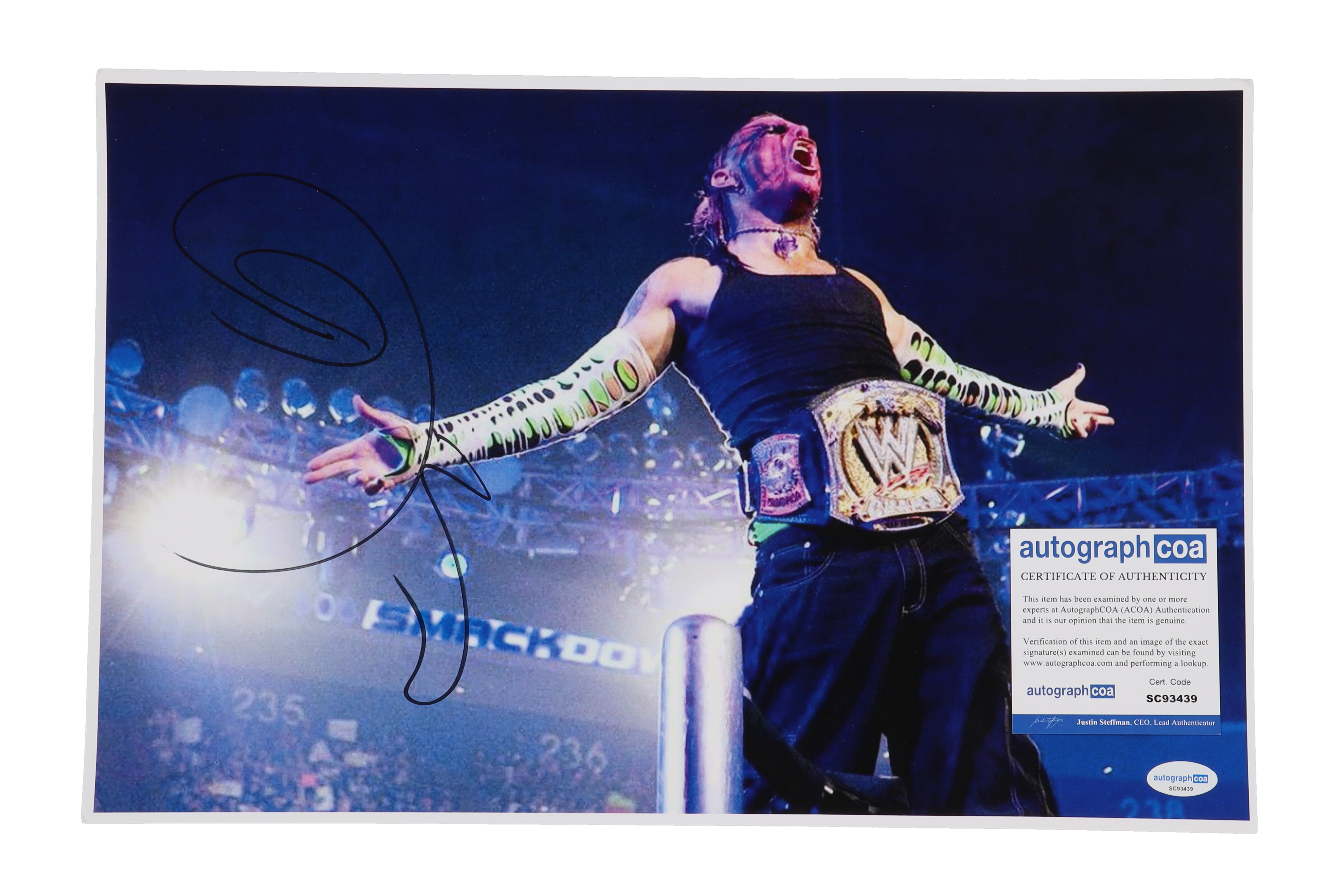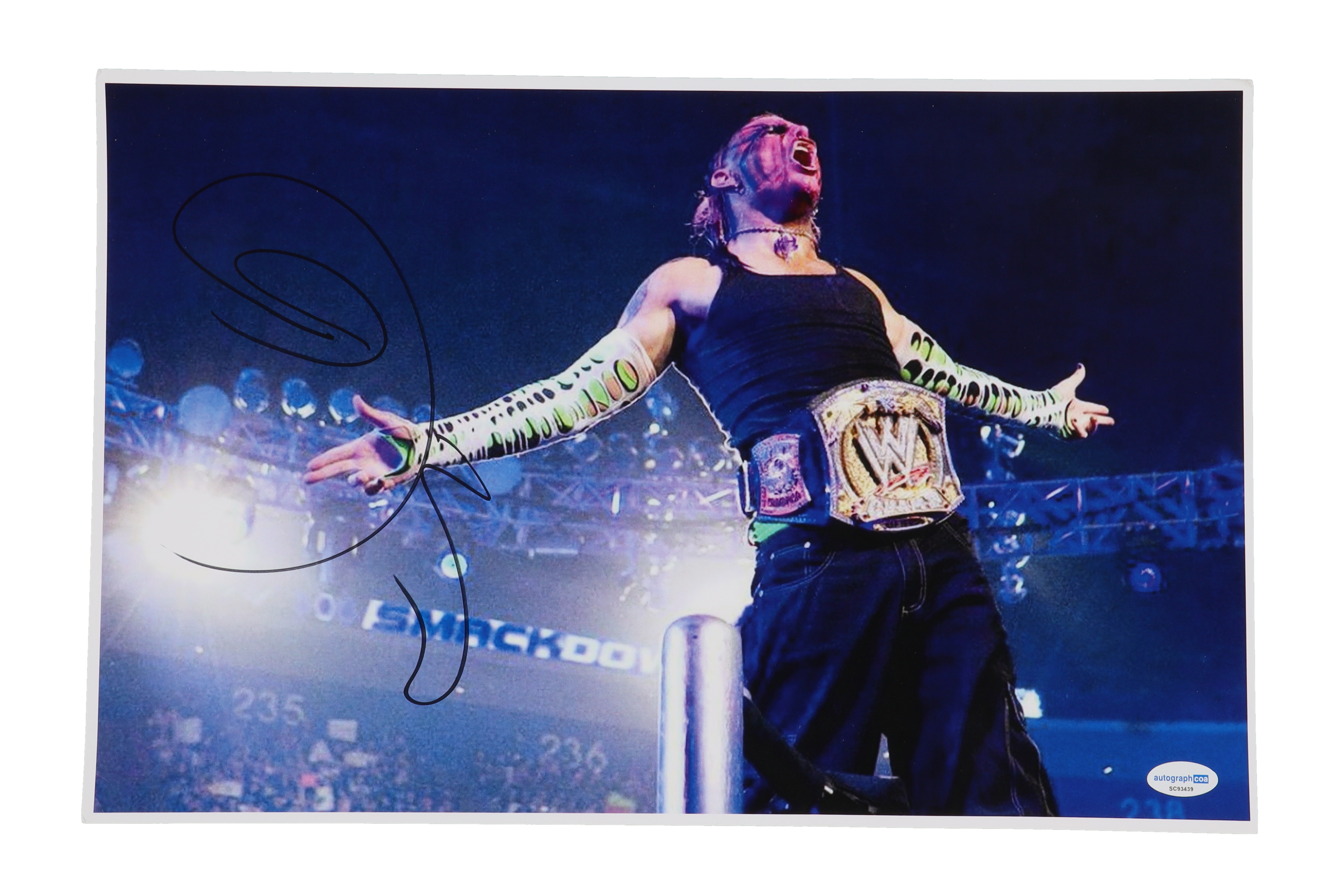 Photo measures 11" x 17" in size and has been hand-signed by Jeff Hardy. Please note, creasing on the corners of the photo.