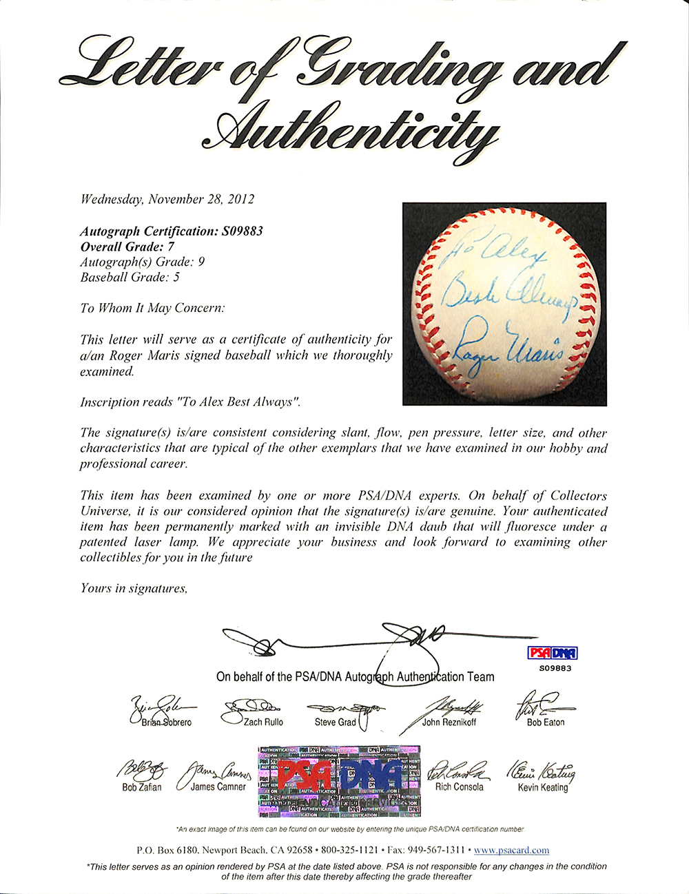 Rawlings Official League Baseball. Hand-signed and inscribed by Roger Maris (D. 1985, New York Yankees). Please note, baseball shows signs of natural toning and the autograph has been personalized "To Alex".