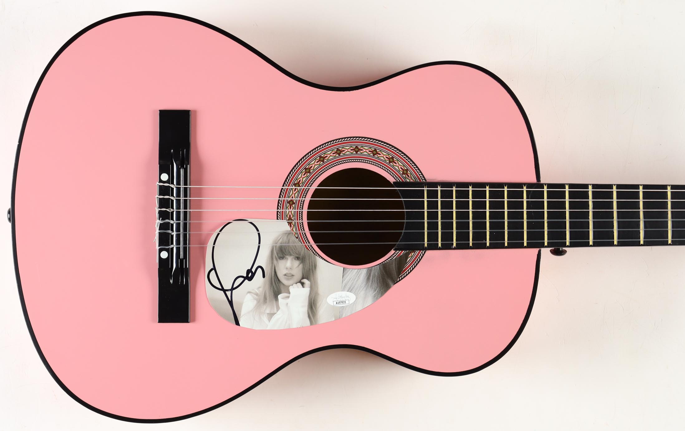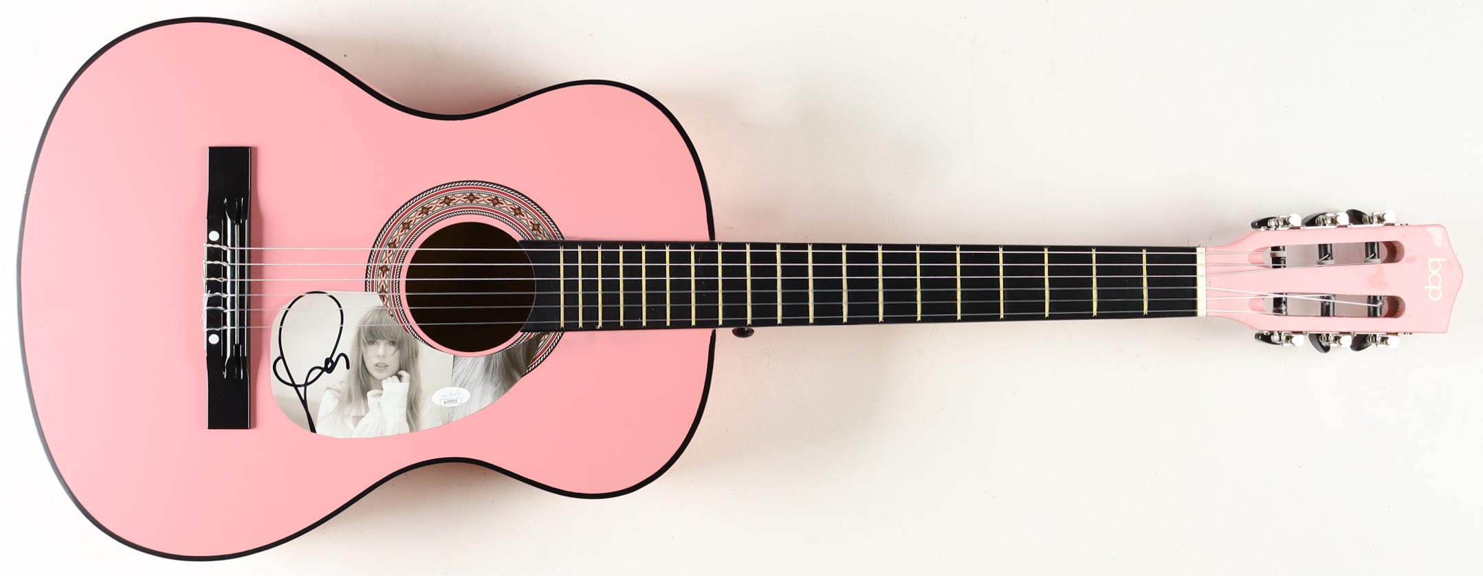 BCP Acoustic guitar measures approximately 38" in length and has been hand-signed on a CD cover that has been repurposed as a pick-guard by Taylor Swift.