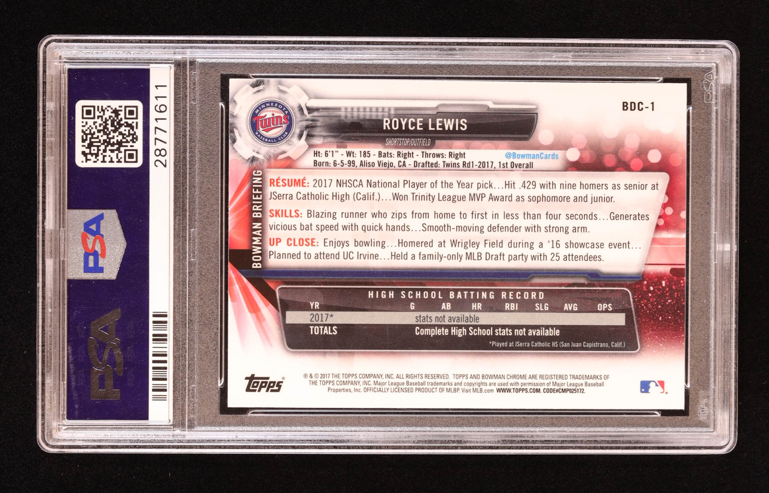 Royce Lewis 2017 Bowman Chrome Draft #BDC1 RC (PSA 10)