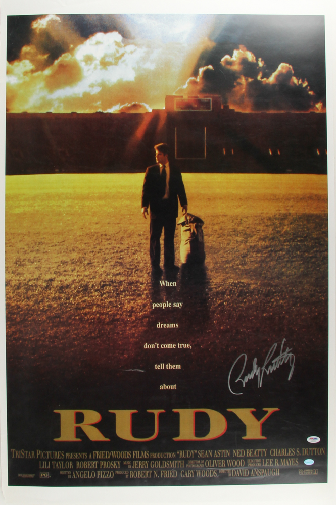 Movie poster photo measures 25" x 38" in size. Hand-signed in silver paint pen by Rudy Ruettiger. Please note there is slight damage to the edge of the poster but once framed will not be visible.