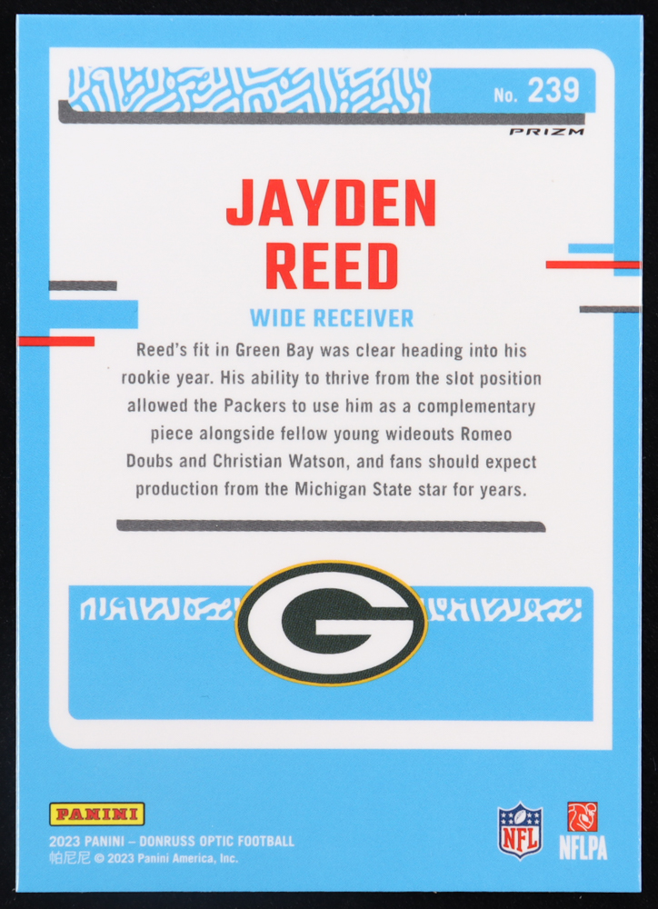 Jayden Reed 2023 Donruss Optic Blue Hyper #239 RR RC