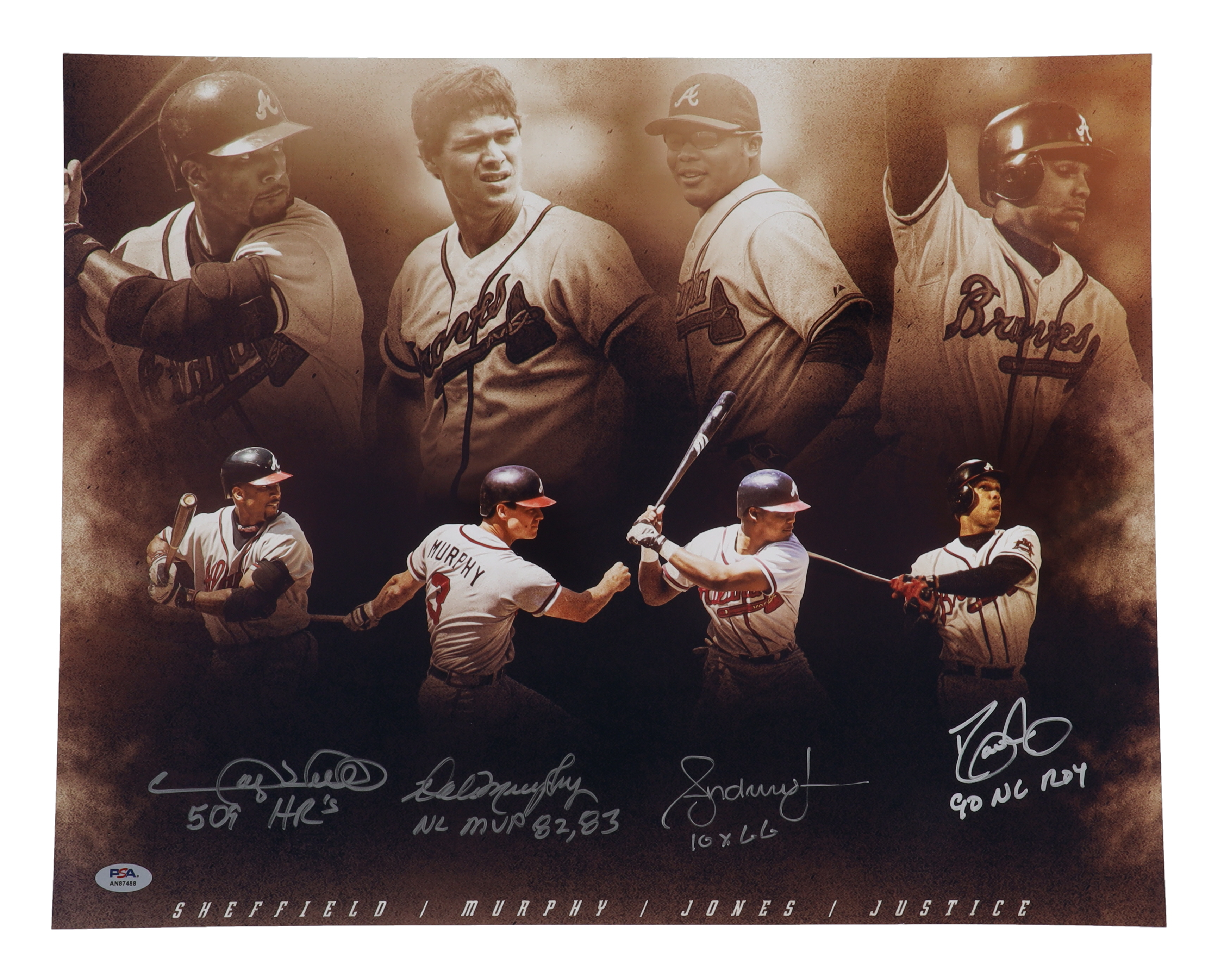 Dale Murphy, David Justice, Andrew Jones & Gary Sheffield Signed Braves 16x20 Photo With (4) Career Stat Inscriptions (PSA)
