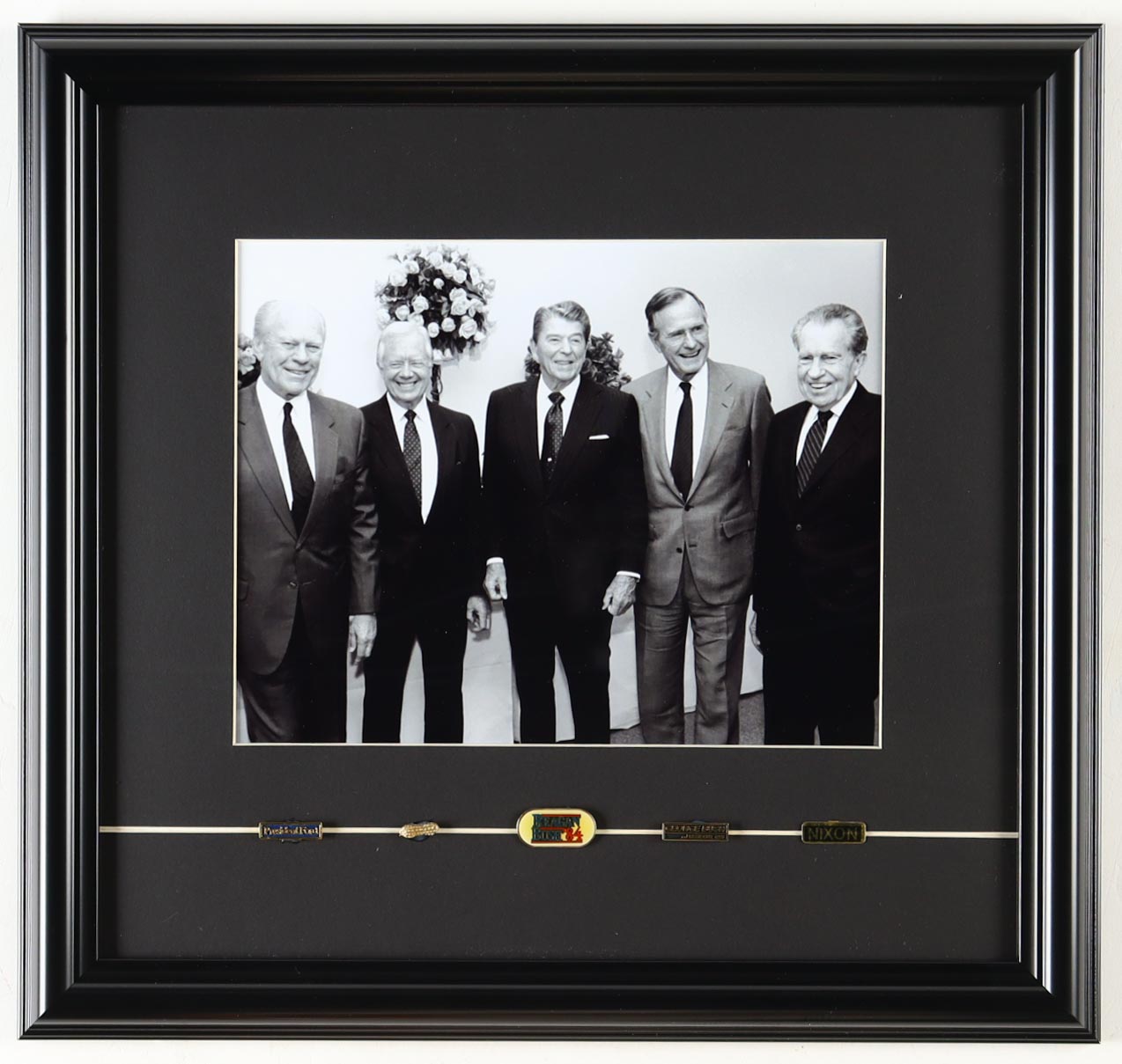 "Five Presidents in the Oval Office" Custom Framed Photo Display with Vintage Presidential Campaign Pins for Ronald Reagan, Gerald Ford, Jimmy Carter, Richard Nixon & George Bush