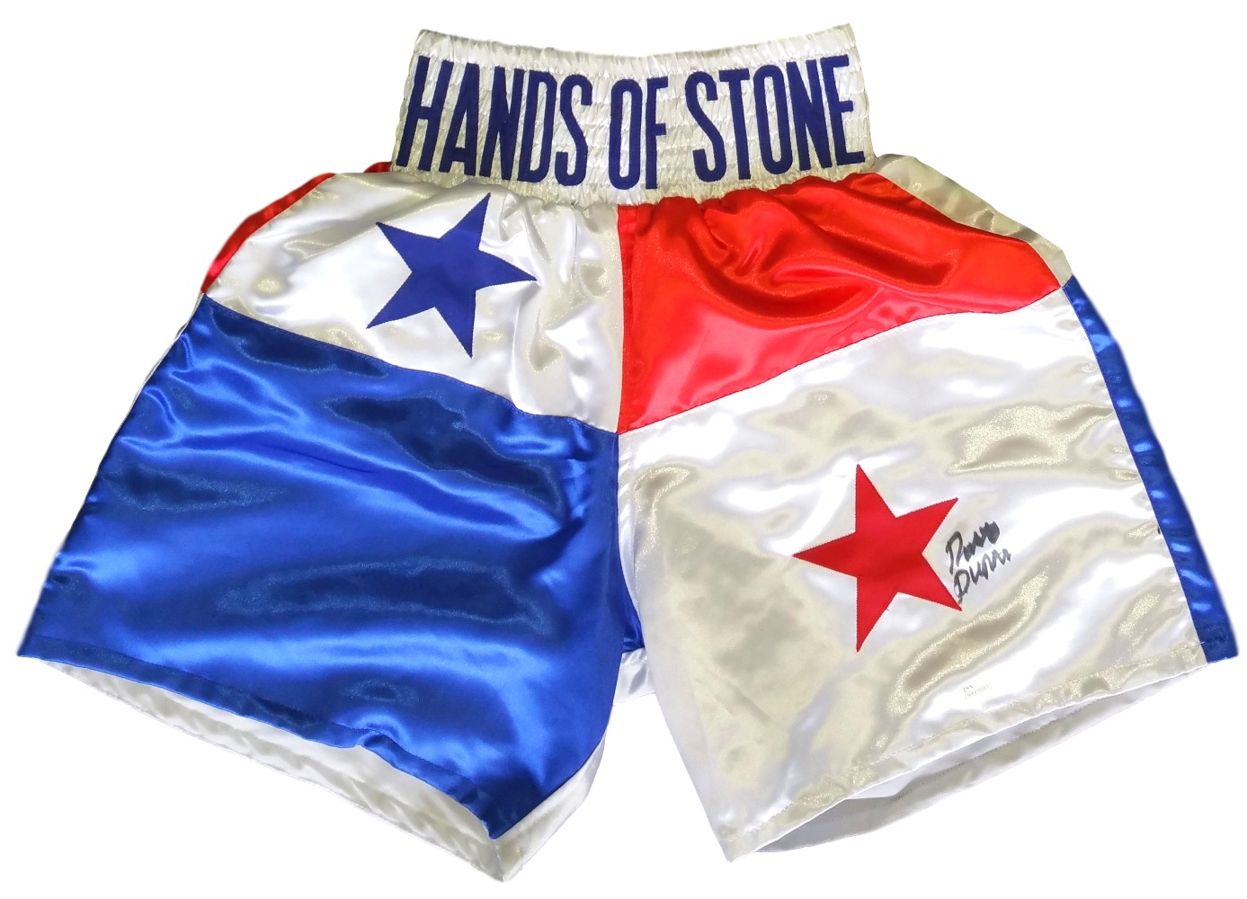 Custom "Hands of Stone" boxing shorts have been hand-signed in black felt-tip pen by Roberto Duran.