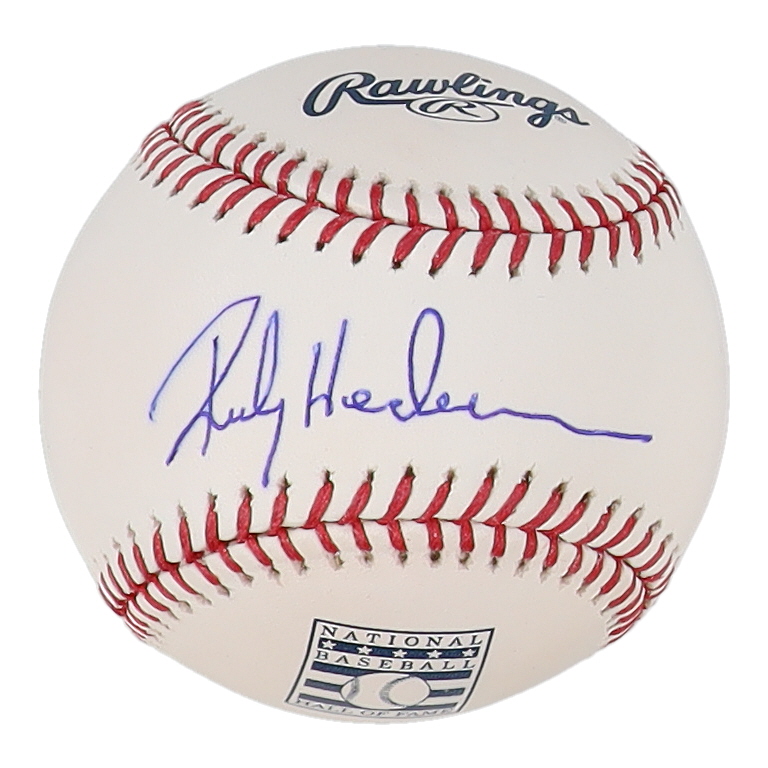 Rawlings Official Hall of Fame Logo Baseball. Hand-signed by Rickey Henderson (Oakland Athletics, HOF). Please note, the signature has bled.