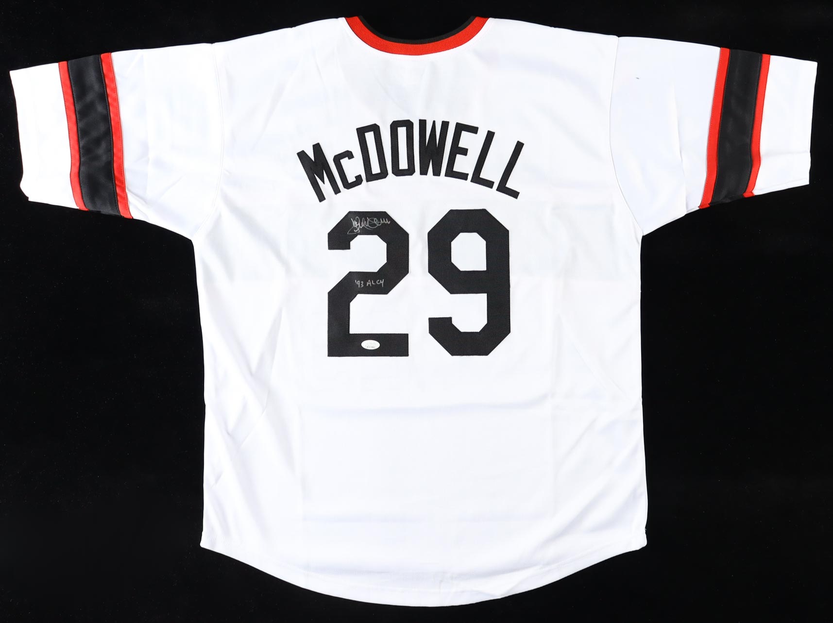 Custom jersey. Everything is sewn on, size XL. Hand-signed and inscribed by Jack McDowell.