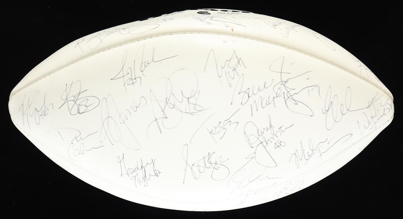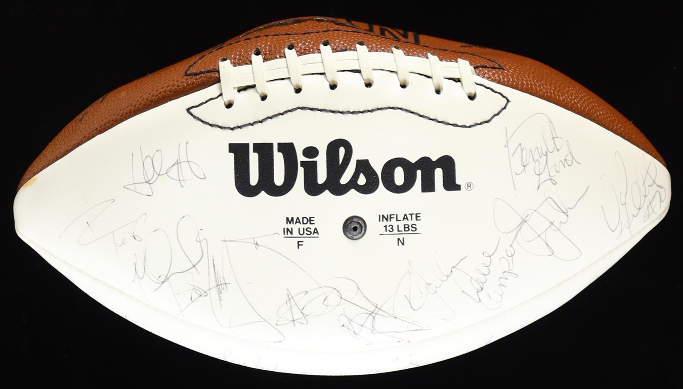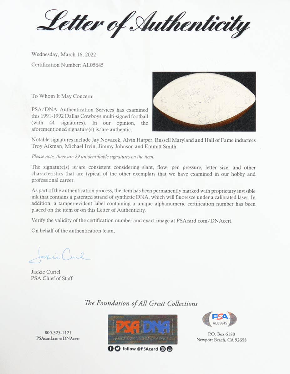 Wilson Official NFL football. Hand-signed by (44) members of the 1991-92 Dallas Cowboys Troy Aikman, Emmitt Smith, Michael Irvin, Jimmy Johnson, Dave Campo, Kenneth Gant, Alvin Harper, Dale Hellestrae, Chad Hennings, Jim Jeffcoat, Daryl Johnston, Robert Jones, Russell Maryland, Godfrey Myles, Jay Novacek and (29) others. Display case is included as shown.