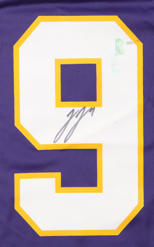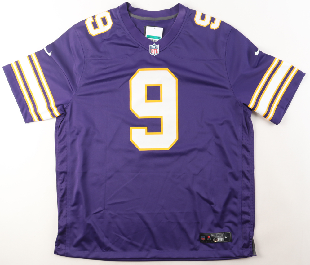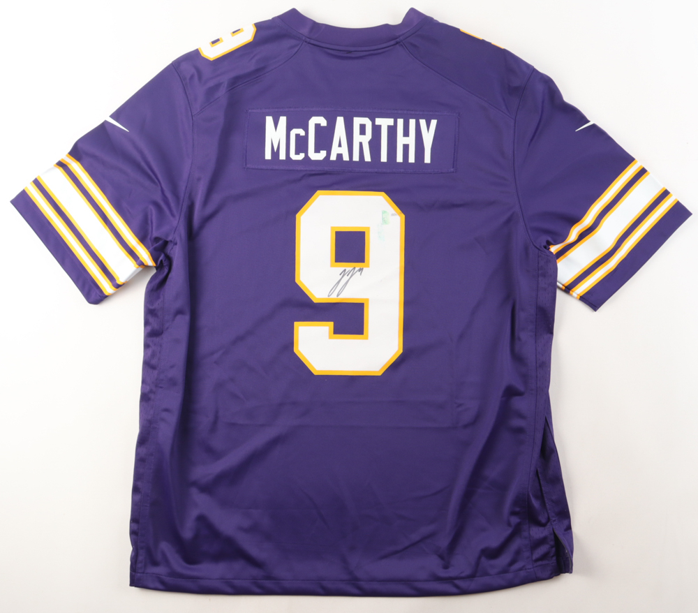 Nike jersey with everything printed on, size XL. Hand-signed by J.J. McCarthy (Minnesota Vikings). Please note, there are stains on the reverse number.