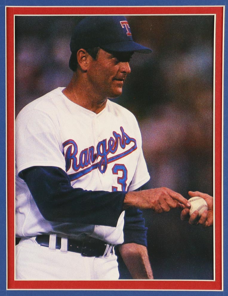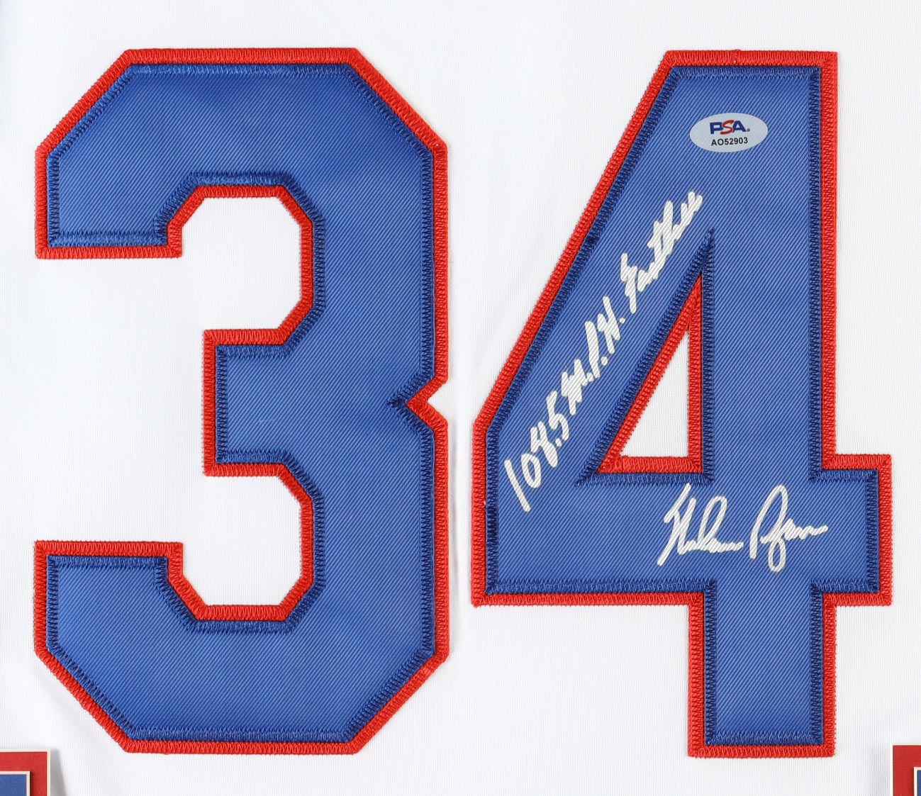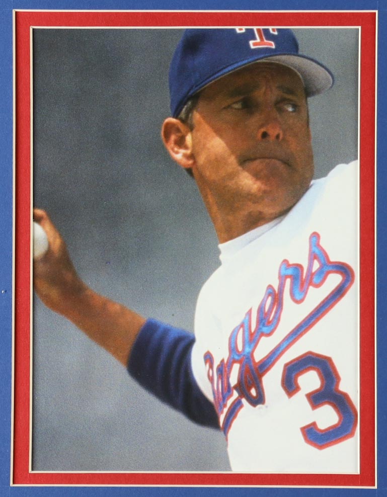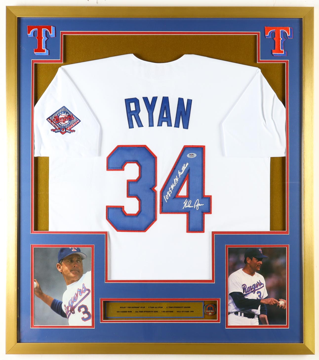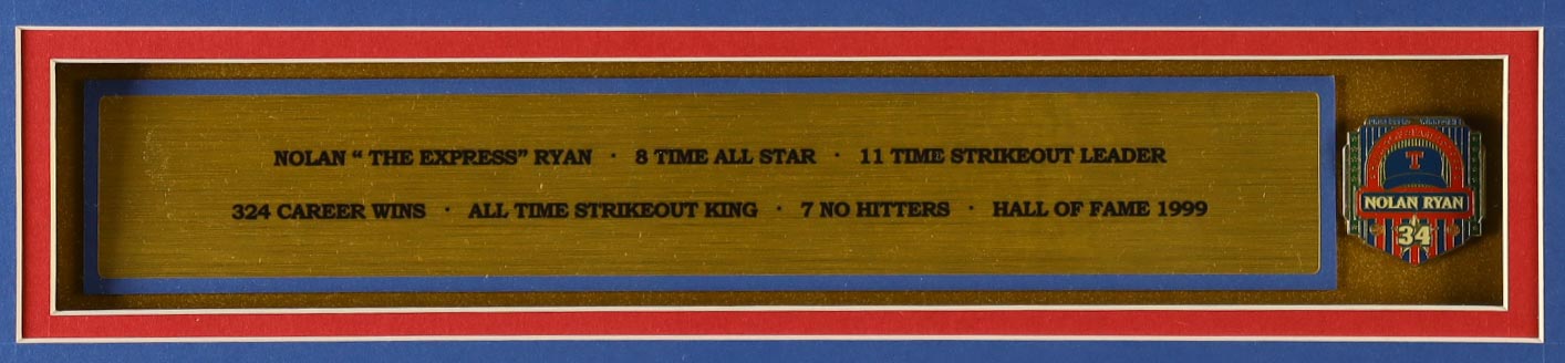 Custom frame measures approximately 32" x 36" in size and features a jersey that has been hand-signed and inscribed by Nolan Ryan (HOF). Display Also includes (2) photos, (2) cloth team logo patches and a player Hall Of Fame induction pin.