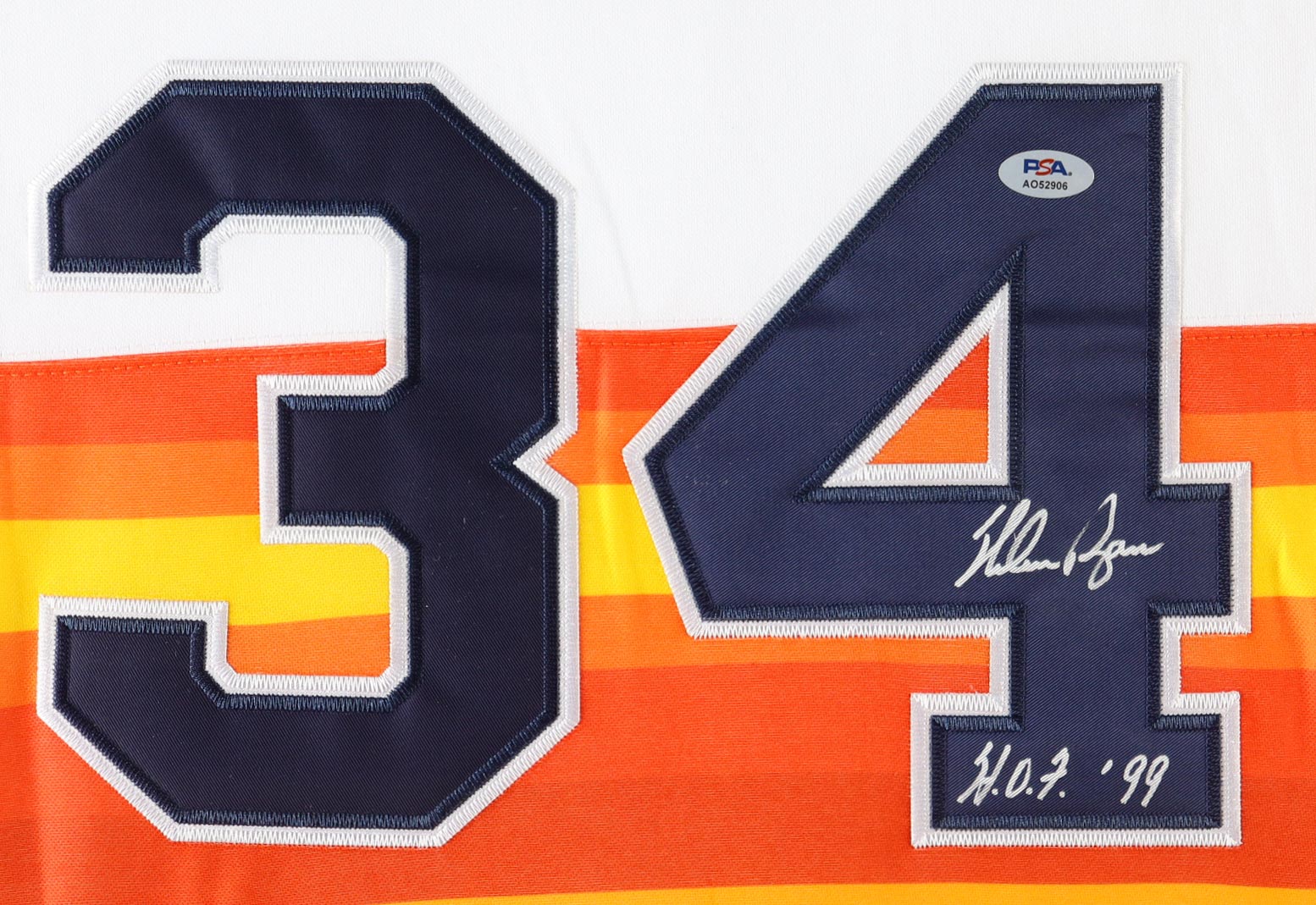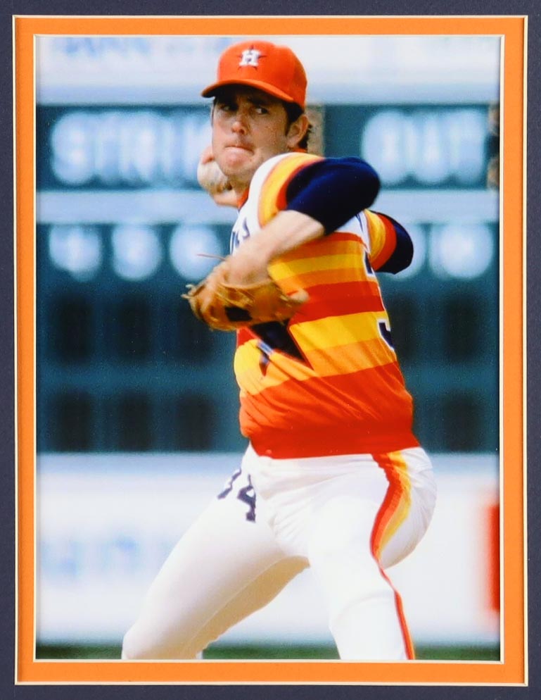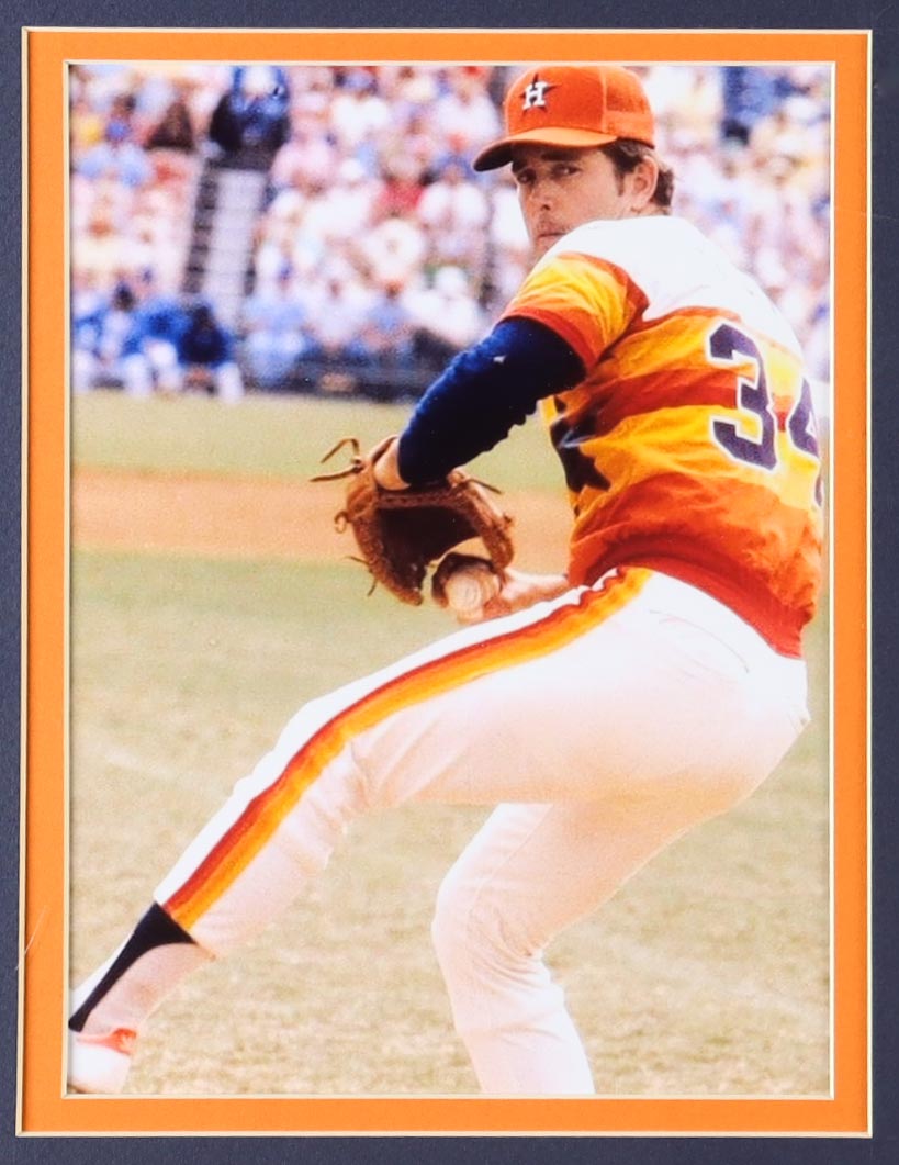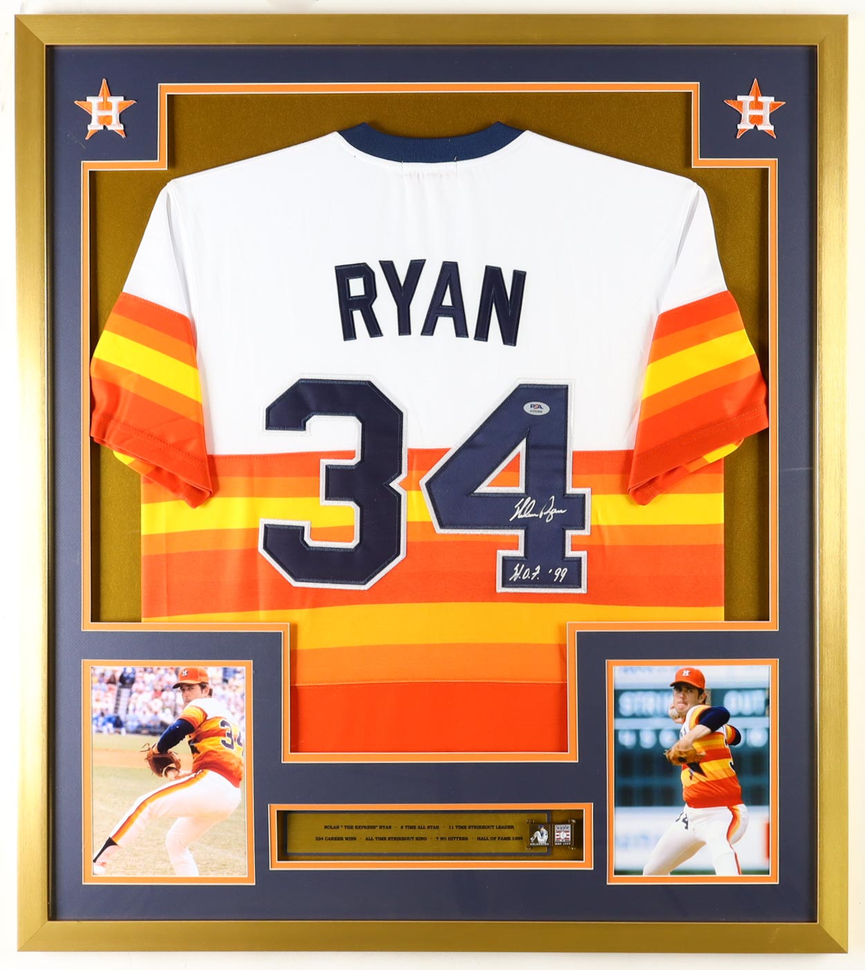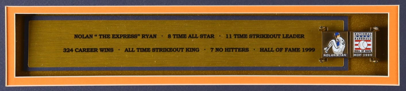 Custom frame measures approximately 32" x 36" in size and features a jersey that has been hand-signed and inscribed by Nolan Ryan (HOF). Display Also includes (2) photos, (2) cloth team logo patches and a hall of fame pin.