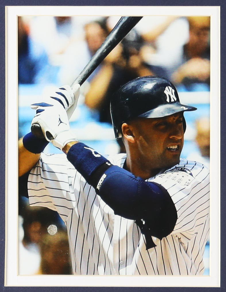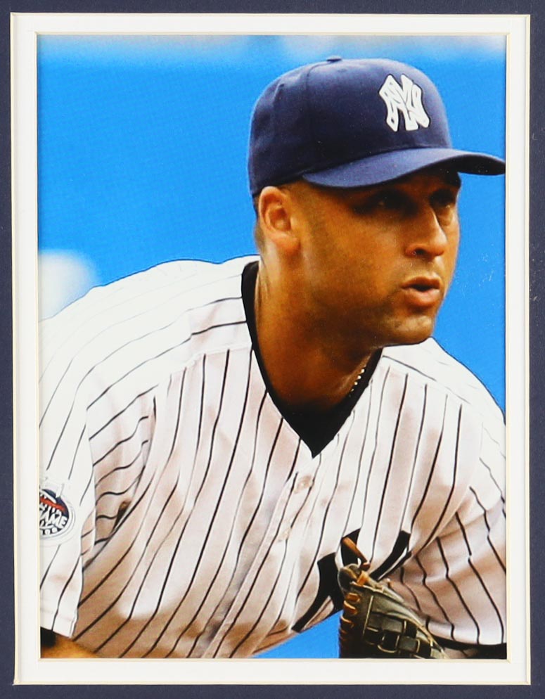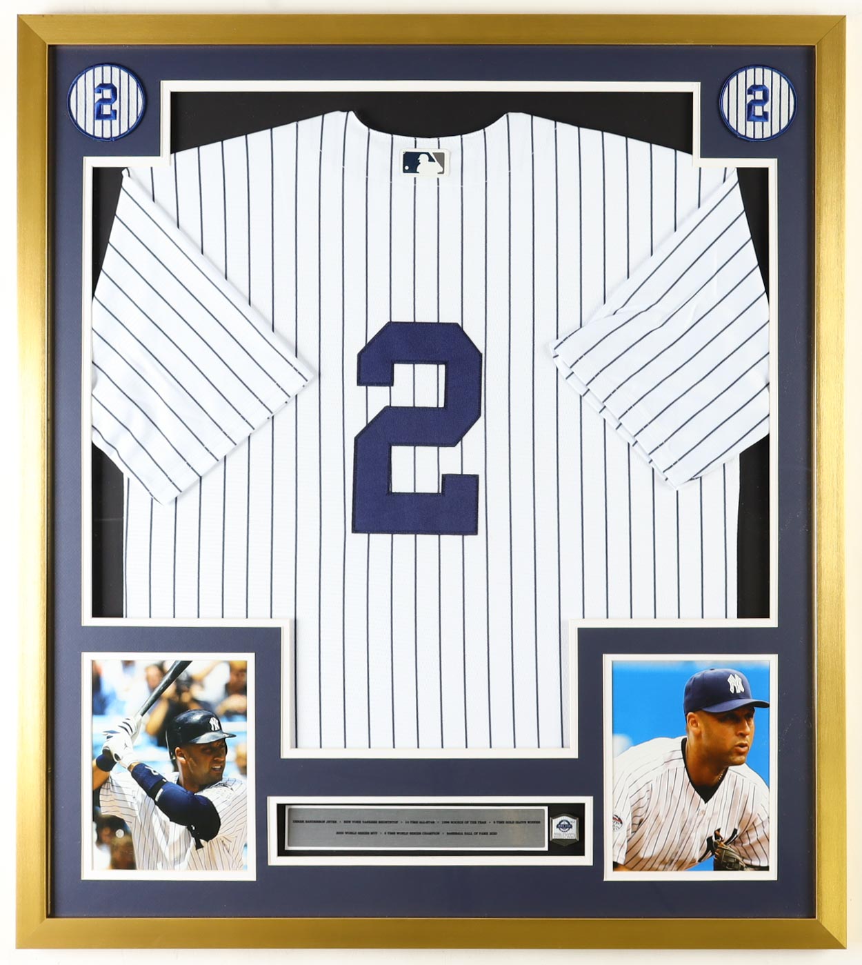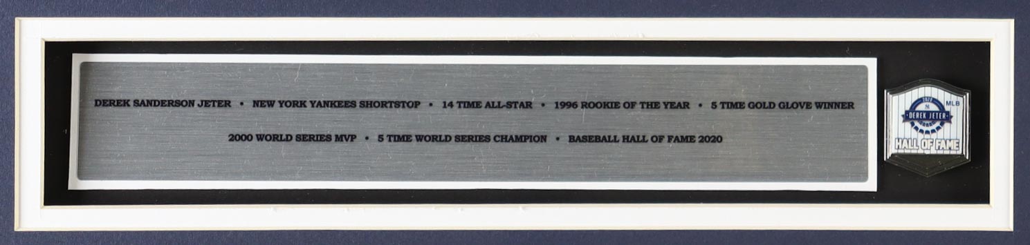 Custom frame measures approximately 32" x 36" in size. The display features an unsigned Derek Jeter (New York Yankees) jersey. The display also includes a Hall Of Fame Induction Pin as well as (2) cloth player number patches. Please note, this item is unsigned.