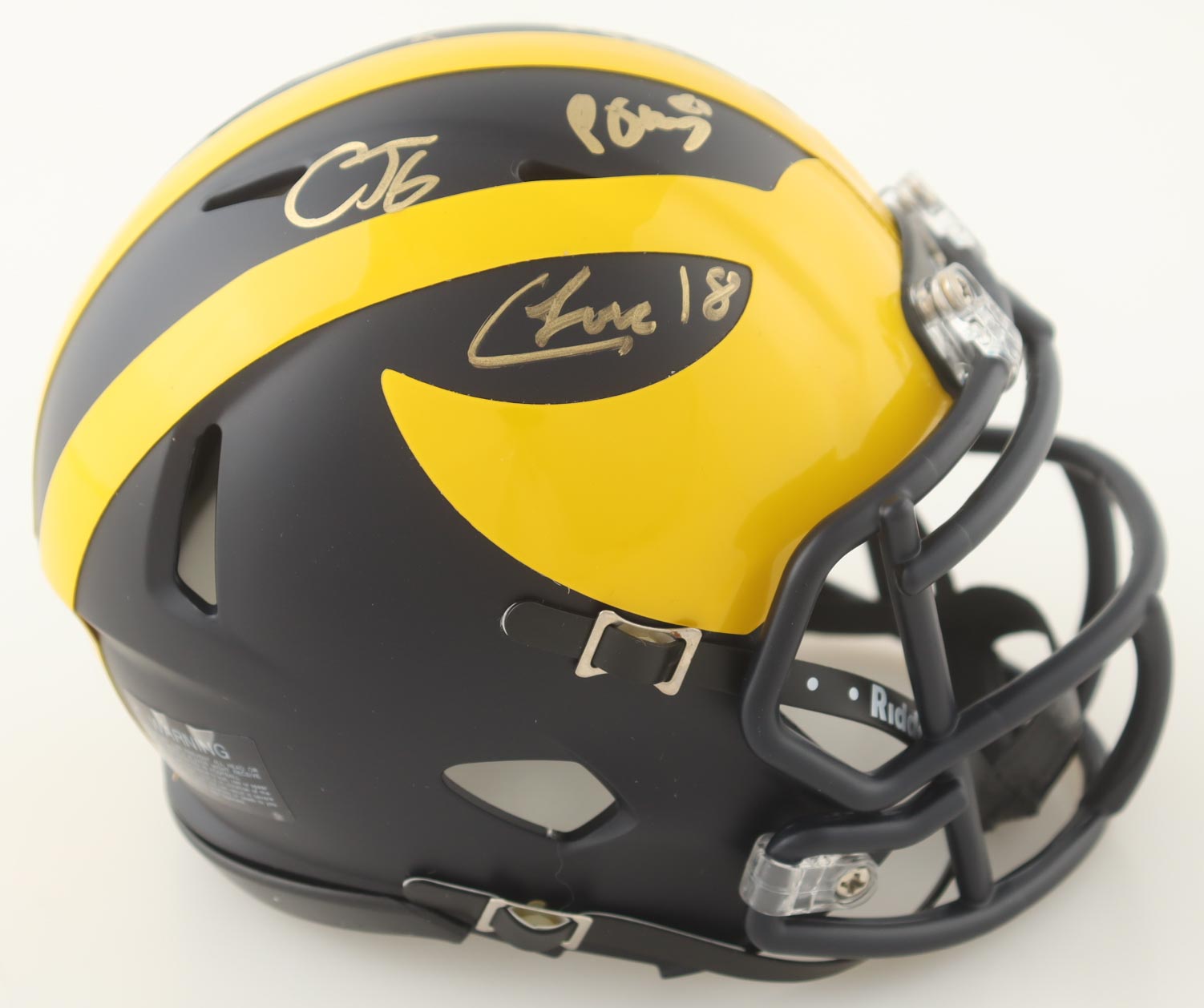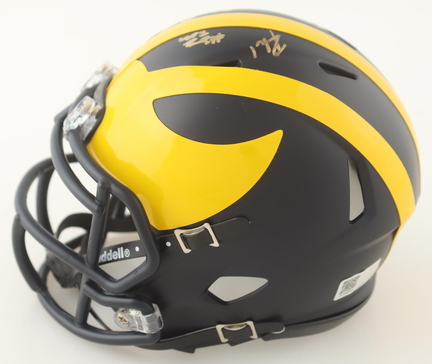 Riddell Michigan Wolverines Speed mini helmet has been hand-signed by Roman Wilson, Colston Loveland, Semaj Morgan, Cornelius Johnson, and Peyton O'Leary.