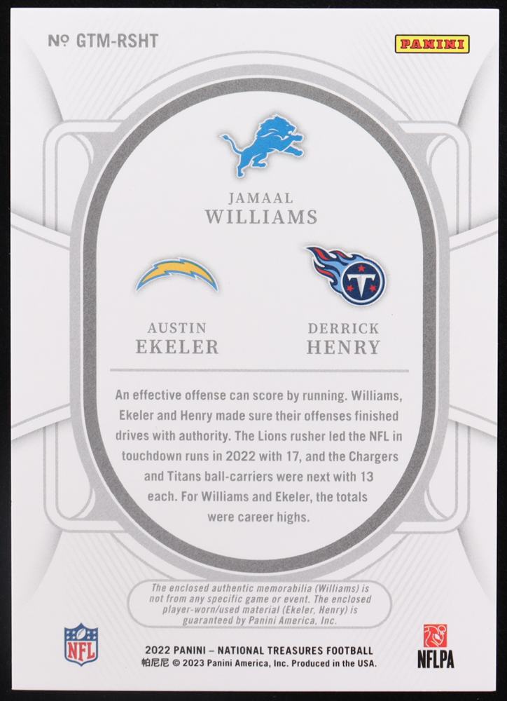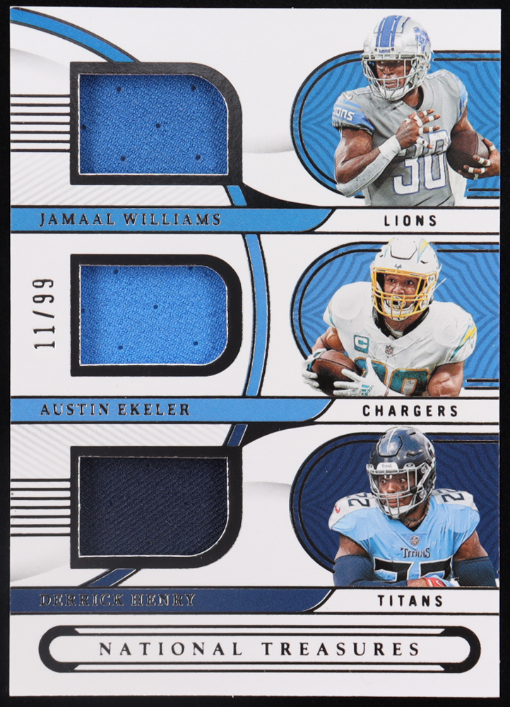 Jamaal Williams / Austin Ekeler / Derrick Henry 2022 Panini National Treasures NFL Gear Trio Materials #13 #11/99