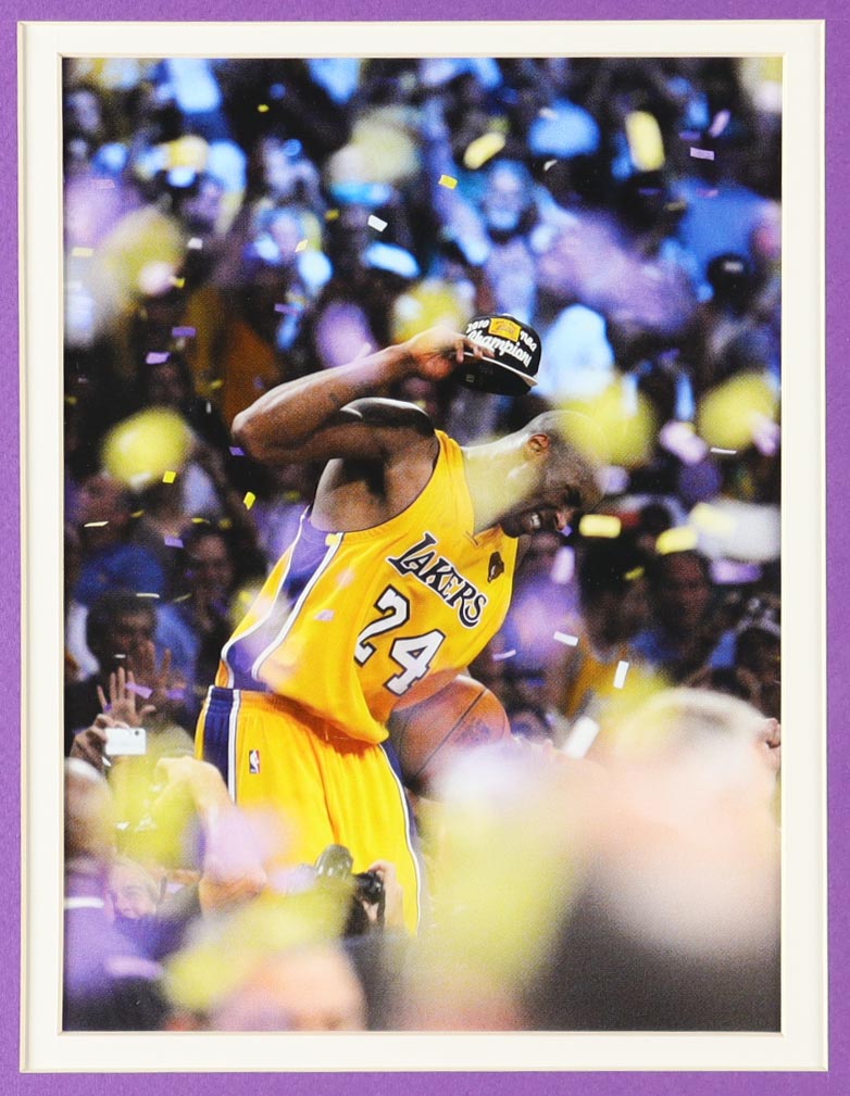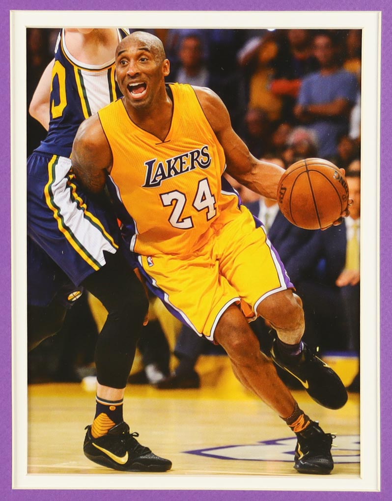 Custom frame measures approximately 32" x 36" in size and features an unsigned Kobe Bryant (D. 2024, Los Angeles Lakers, HOF) jersey as well as a player jersey retirement pin, (2) cloth team logo patches and (2) Photos.