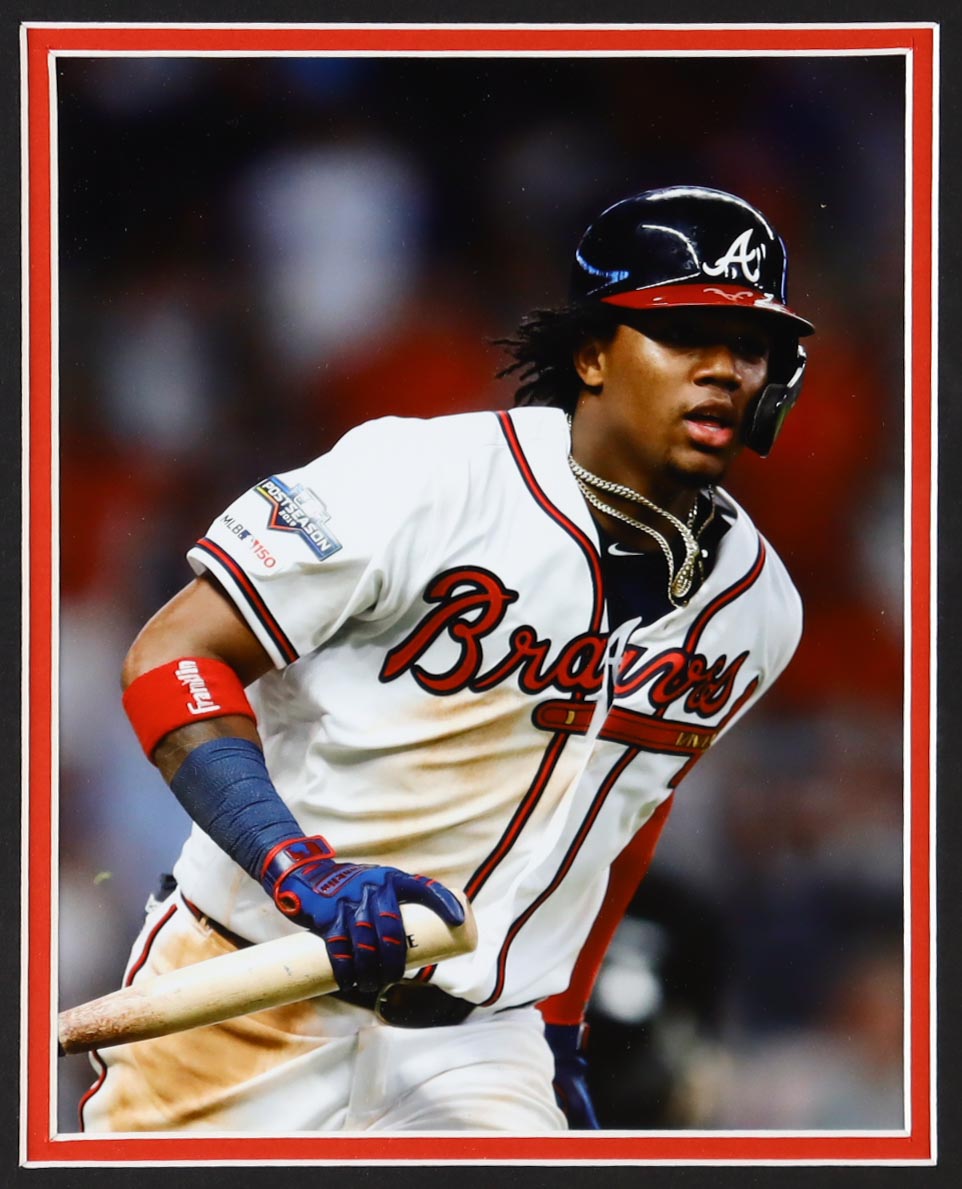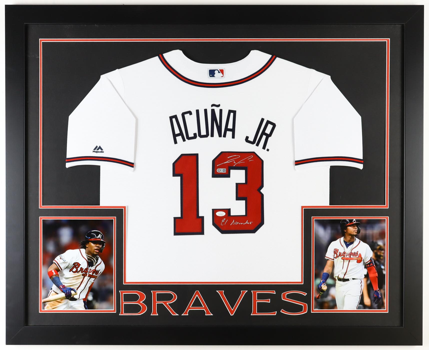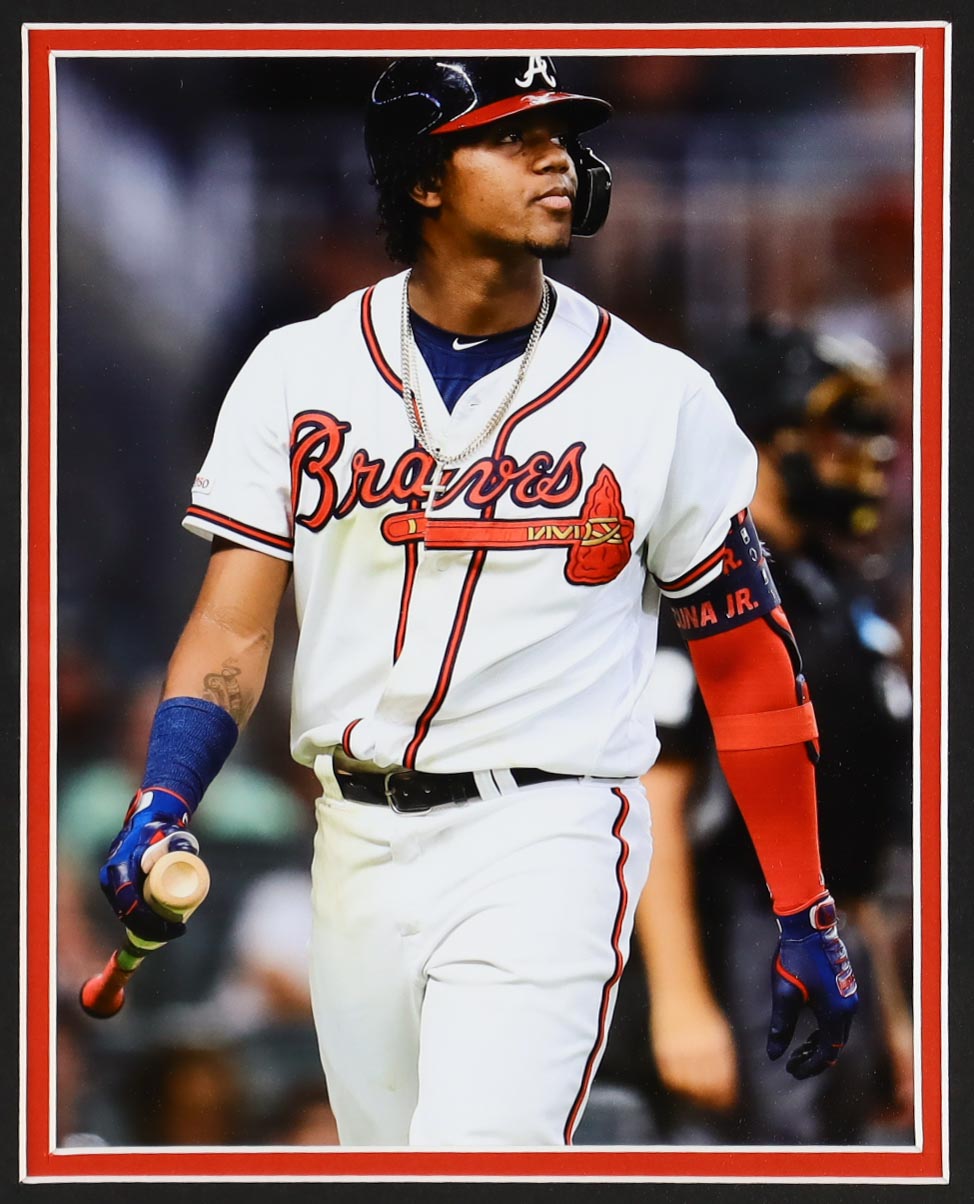 Custom frame measures approximately 35" x 43" in size and features a jersey hand-signed and inscribed by Ronald Acuna Jr.