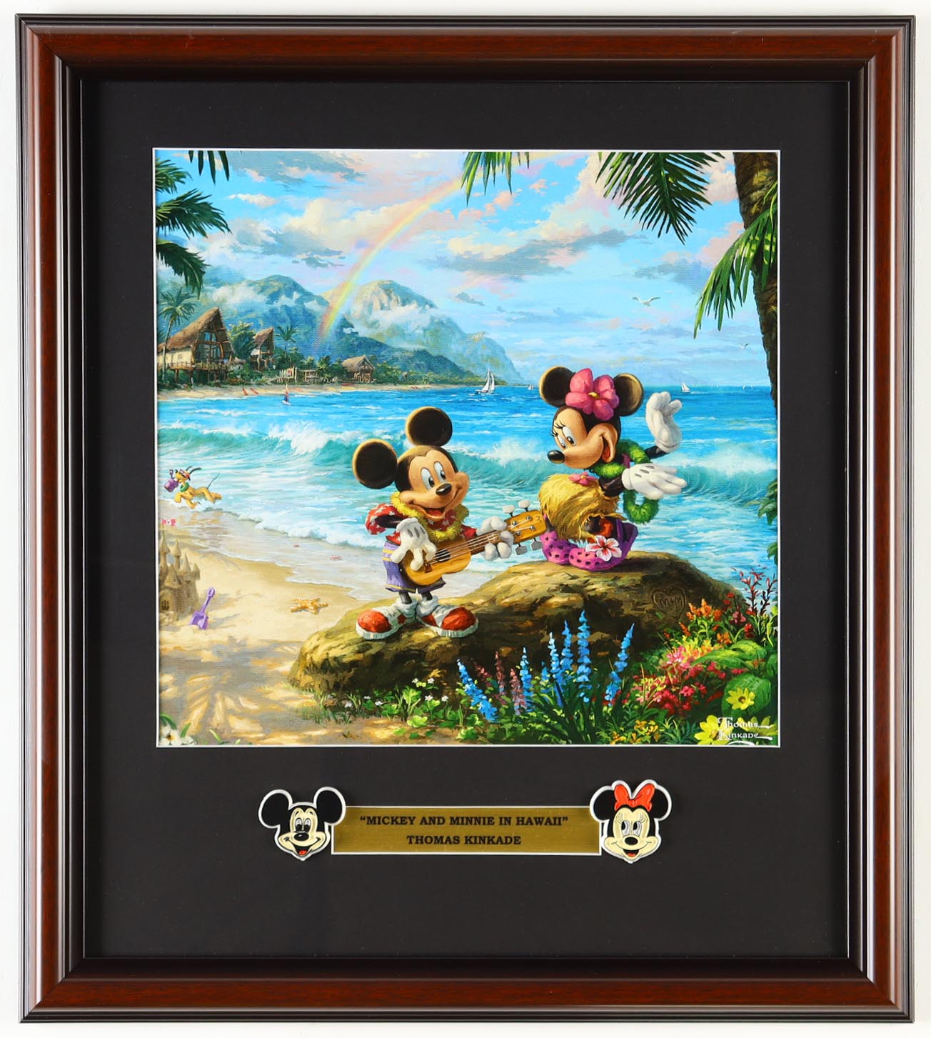 Custom frame measures approximately 16" x 18" in size and features a print of "Mickey and Minnie in Hawaii" by artist Thomas Kinkade (D. 2012). Includes Mickey and Minnie Mouse pin. Please note, the display is unsigned.