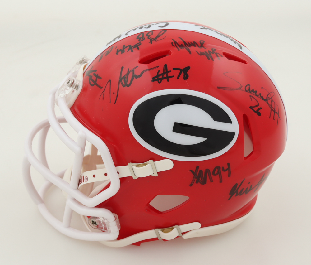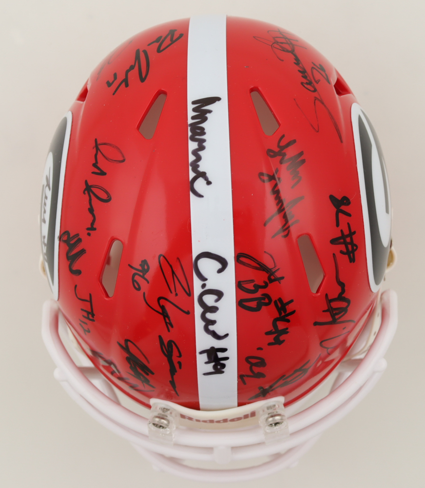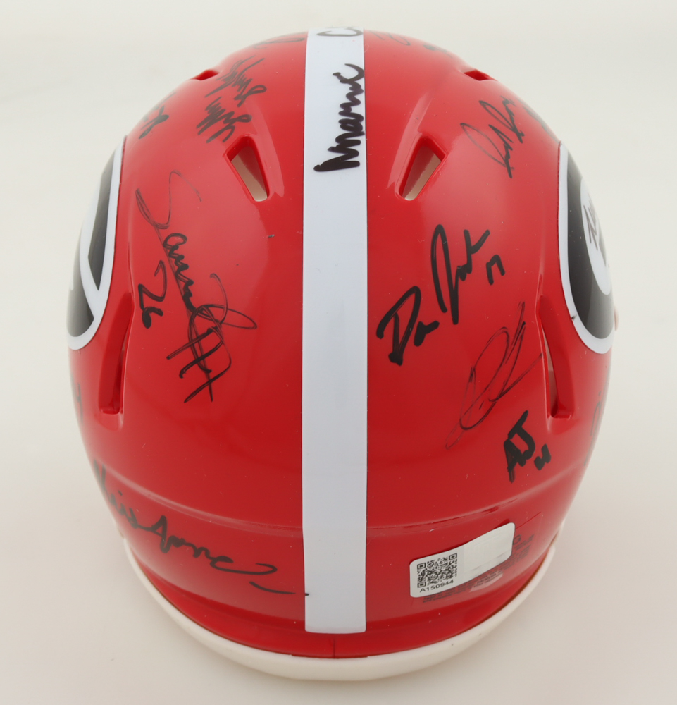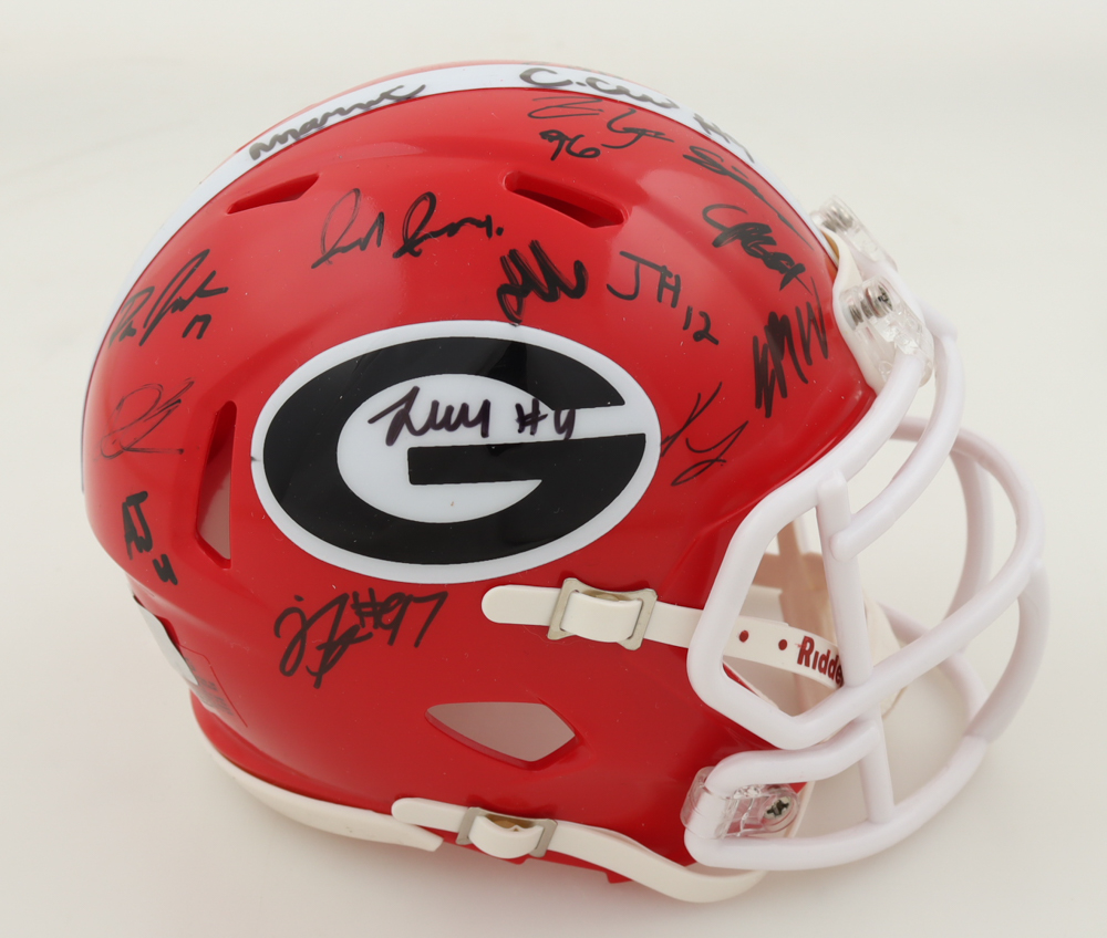 Riddell Georgia Bulldogs Speed Mini Helmet. Team-signed by (34) with Brock Vandagriff, Dominic Lovett, KJ Bolden, Sam Bush, Jamaal Jarrett, Julian Humphrey, Dan Jackson, Tyler Williams, Xzavier McLeod, Nazir Stackhouse, Dylan Fairchild, Jackson Meeks, Micah Morris, William Mote, Jared Wilson, Arian Smith and (18) others.