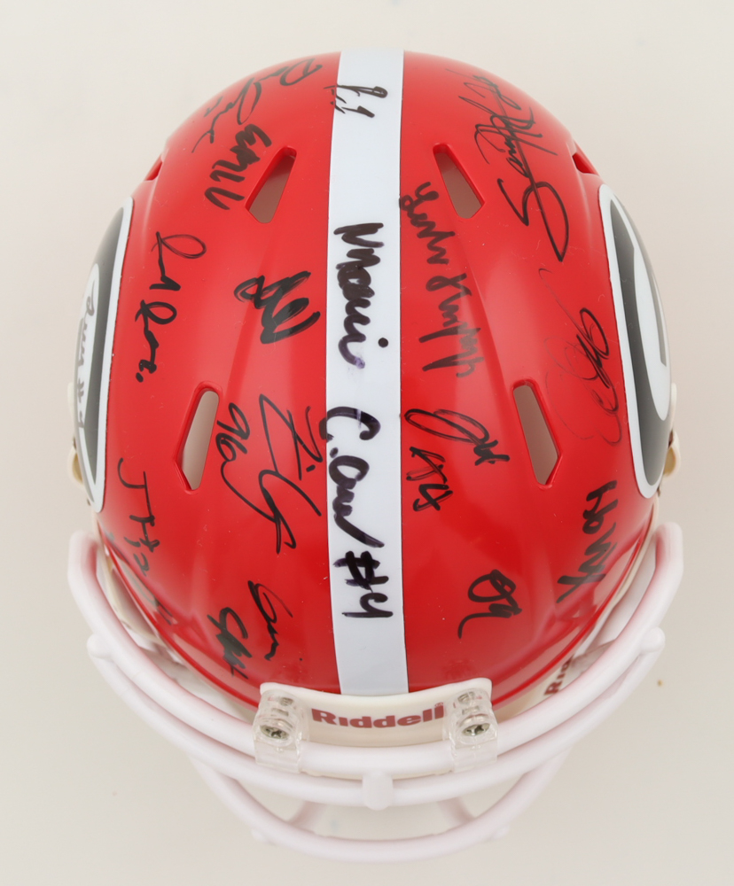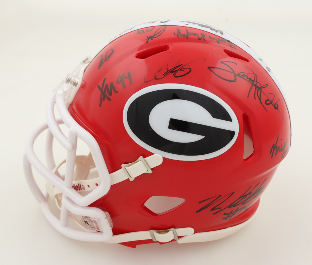 Riddell Georgia Bulldogs Speed Mini Helmet. Team-signed by (34) with Brock Vandagriff, Dominic Lovett, KJ Bolden, Sam Bush, Jamaal Jarrett, Julian Humphrey, Dan Jackson, Tyler Williams, Xzavier McLeod, Nazir Stackhouse, Dylan Fairchild, Jackson Meeks, Micah Morris, William Mote, Jared Wilson, Arian Smith and (18) others.