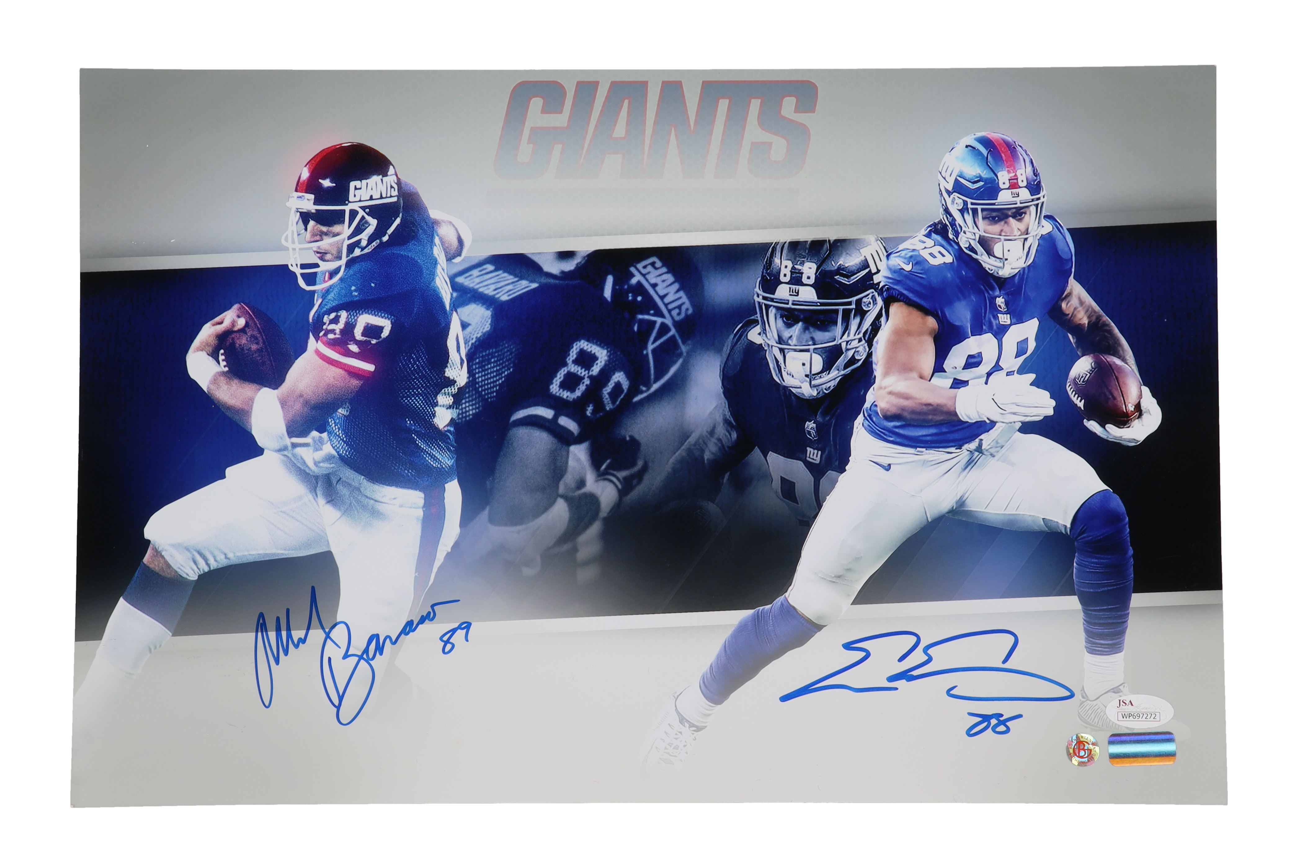 Photo measures 11" x 17" in size and is hand-signed by Evan Engram & Mark Bavaro (New York Giants). Please note, the bottom-left of the photo is creased.