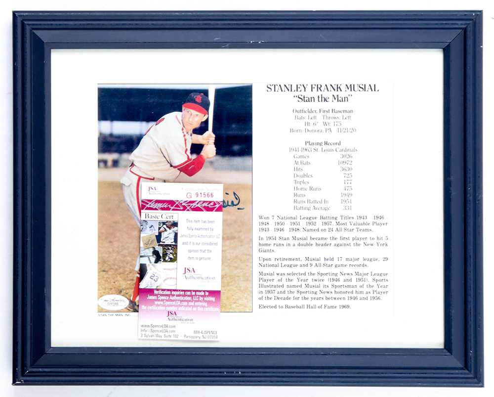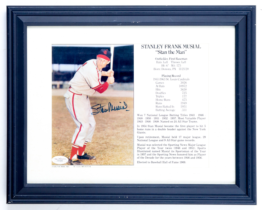 Custom frame measures 12" x 15" in size and features a photo that has been hand-signed by Stan Musial (D. 2013, St. Louis Cardinals, HOF). Please note there is damage to the framing.