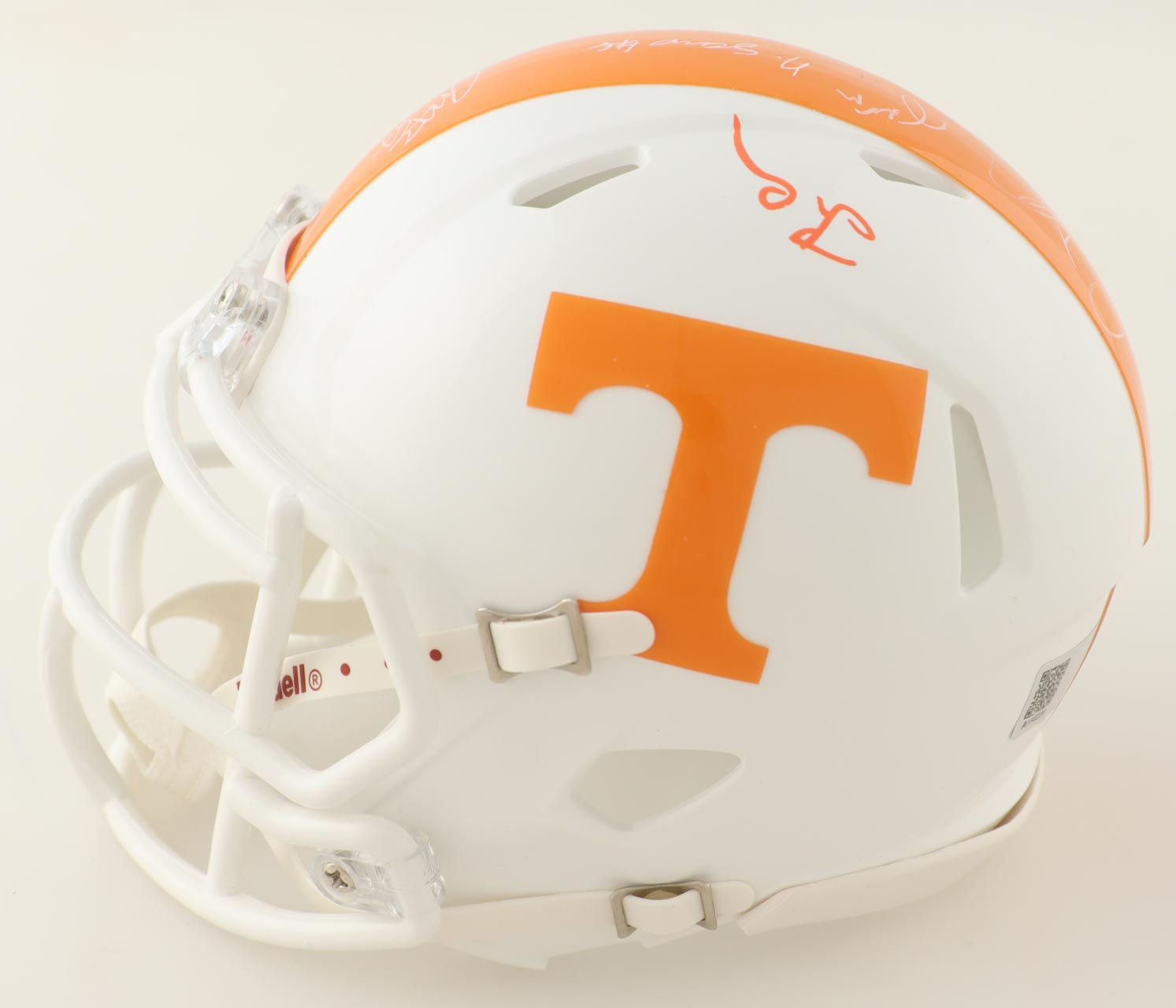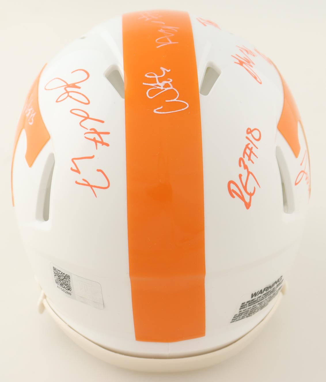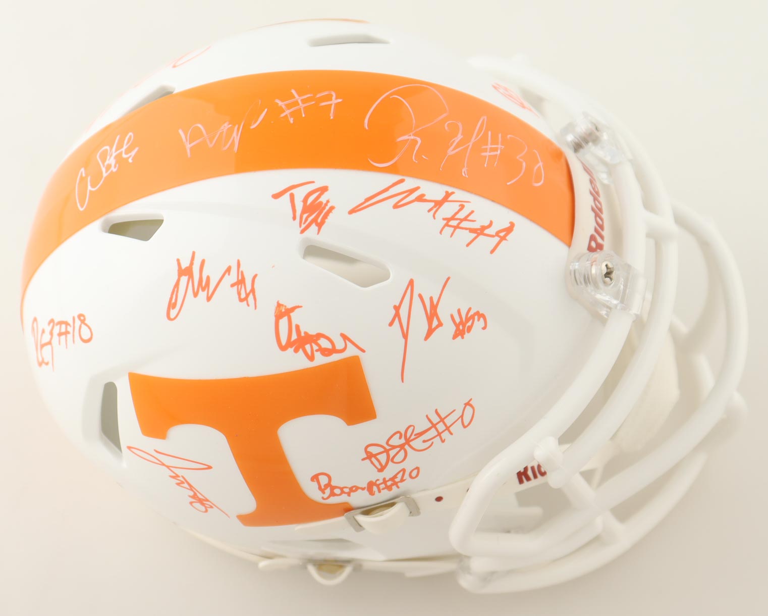 Riddell Tennessee Volunteers speed mini helmet. Helmet is hand-signed by (15) members of the 2023 Tennessee Volunteers Defense with some of the signers including Doneiko Slaughter, Bryson Eason, Rickey Gibson III, Luke Shouse, Arion Carter, Roman Harrison, James Pearce Jr., Omari Thomas, Wesley Walker, with many others unknown. Will receive a limited edition #/50.