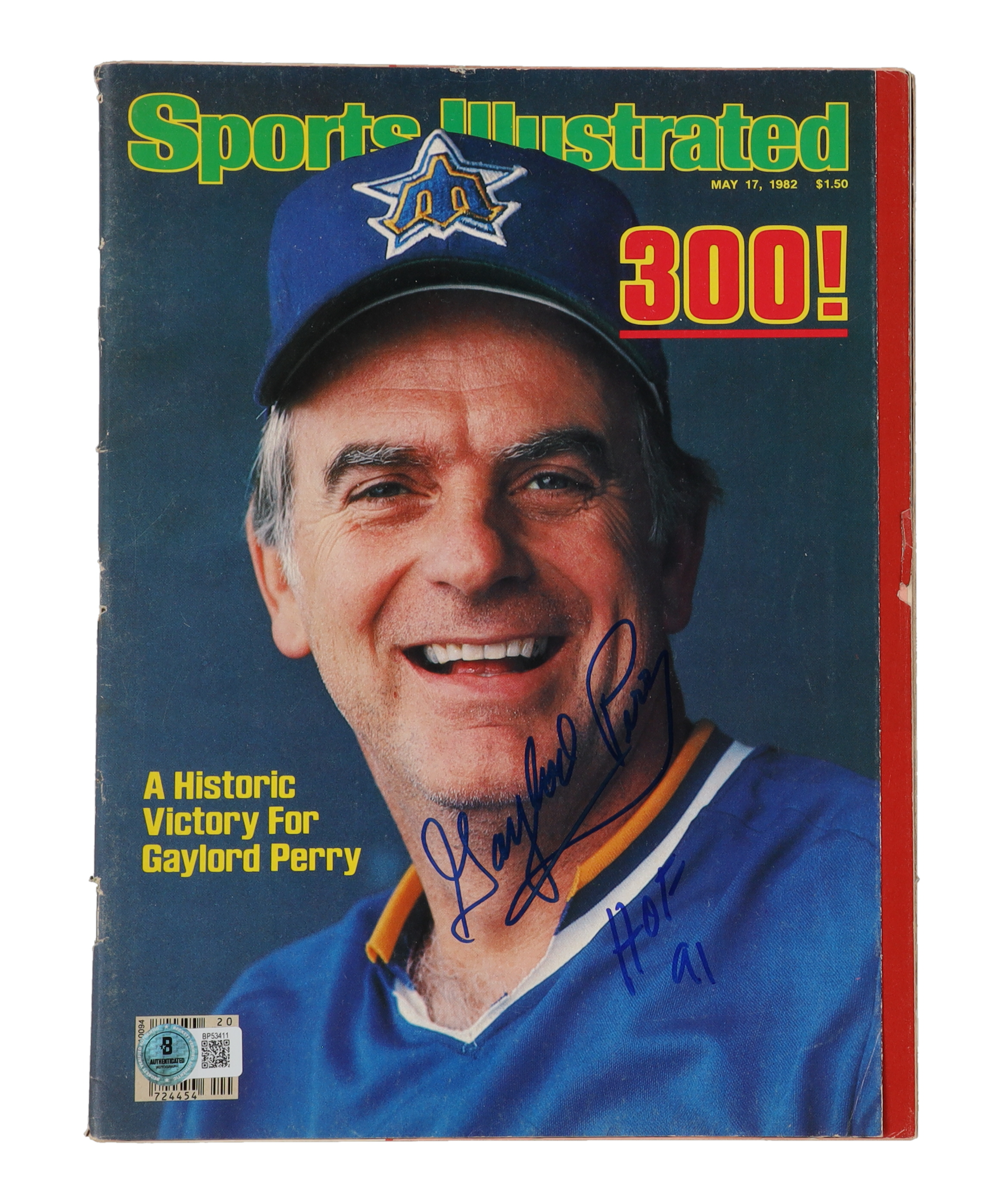 May 17th, 1982 issue of Sports Illustrated magazine. Hand-signed and inscribed on the cover by Gaylord Perry (D. 2022, Seattle Mariners, HOF). Please note, tear on the right side of the magazine.